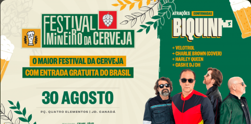 O maior festival de cerveja artesanal com entrada gratuita do Brasil será realizado no próximo dia 30 de agosto de 2025, na praça Quatro Elementos no Jardim Canadá com grande atração nacional: Biquíni. A banda liderada por Bruno Gouveia vai levar seu repertório especial para o palco do Festival Mineiro da Cerveja festa que celebra o sucesso de Minas no mercado de cervejas. Serão dez cervejarias que levarão seus rótulos especiais e premiados para o evento.