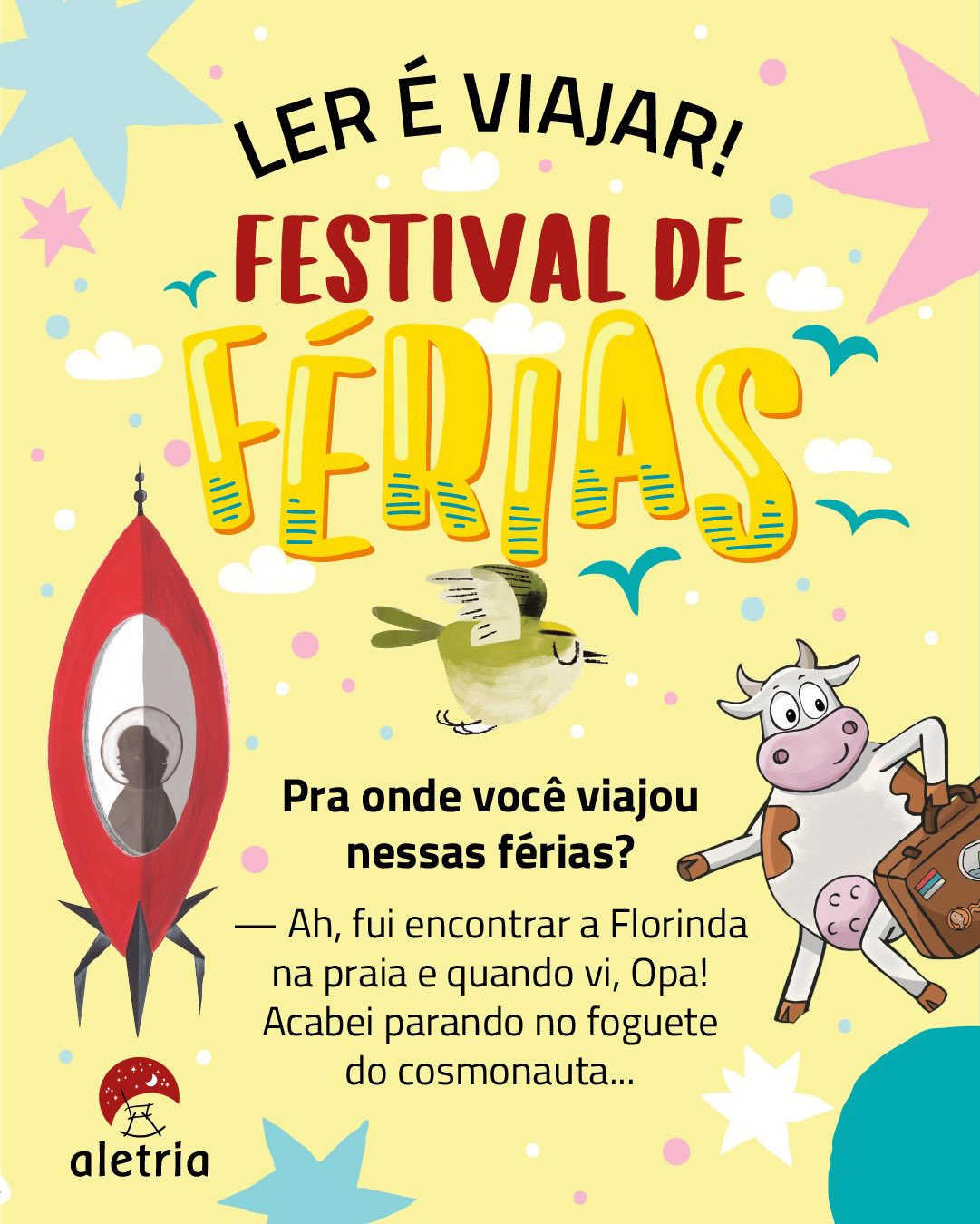 Na segunda quinzena de janeiro (21 a 31), a Livraria da Editora Aletria promove o “Festival de Férias: Ler é Viajar!” com programação imperdível para as crianças. Toda a programação está fixada no instagram, com dois turnos por dia. Todo dia terá contação de histórias, oficinas e até um lanchinho pra socializar.