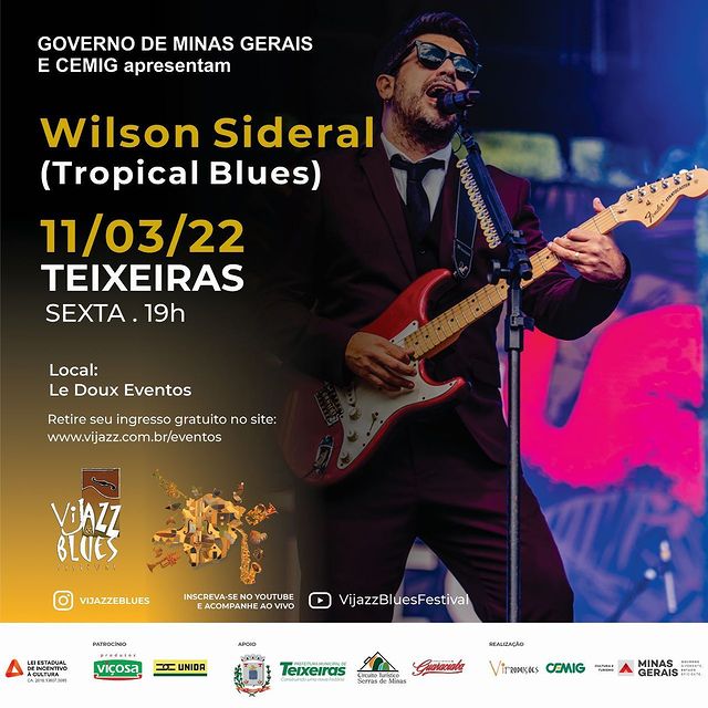 Em seguida, a atração é o cantor, compositor e guitarrista Wilson Sideral, o show Tropical Blues faz reverência e inspira-se no blues, essa língua universal, música mãe do jazz, do soul, rock'n'roll, entre outras maravilhas modernas, para cantar o Brasil. De Luiz Gonzaga a Mutantes e Jorge Ben Jor; dos “blues do Djavan” ao caipira de Tonico & Tinoco; passando pela Bahia de Gil e Caetano, e de Raul!