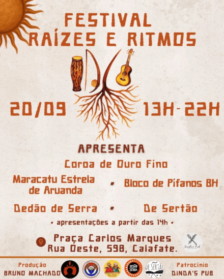 O Festival Raízes e Ritmos acontecerá no dia 20 de setembro (sábado), na Praça Carlos Marques – Prado, das 13h às 22h, com o apoio do Dindas Pub Restaurante.