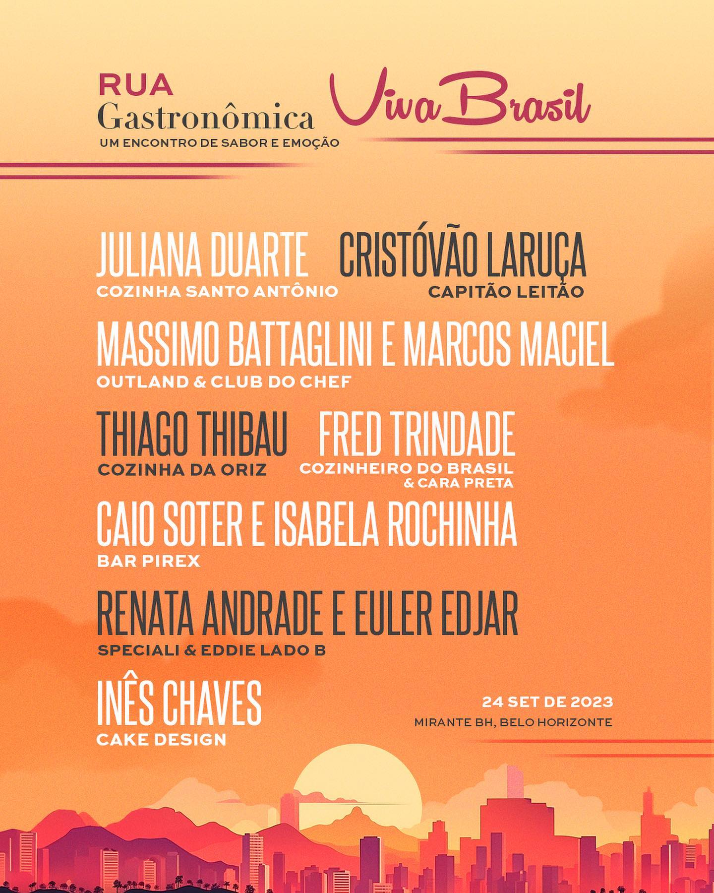 Além dessa experiência musical e afetiva, acompanhada de um deslumbrante pôr do sol, o Viva Brasil oferece uma explosão de sensações — com chefs renomados convidados, food trukcs e muito mais — em sua Villa Gastronômica.