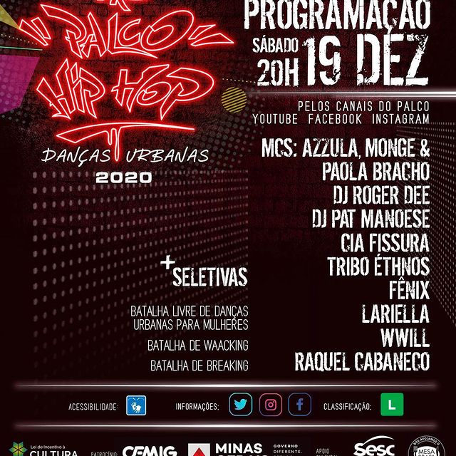 De volta, um dos mais relevantes festivais voltados para a cultura de rua e a dança urbana no Brasil, o Palco Hip Hop, será realizado de 14 a 20 de dezembro, desta vez em formato online, com transmissão às 19h e 20h, no canal do youtube e no instagram do festival.