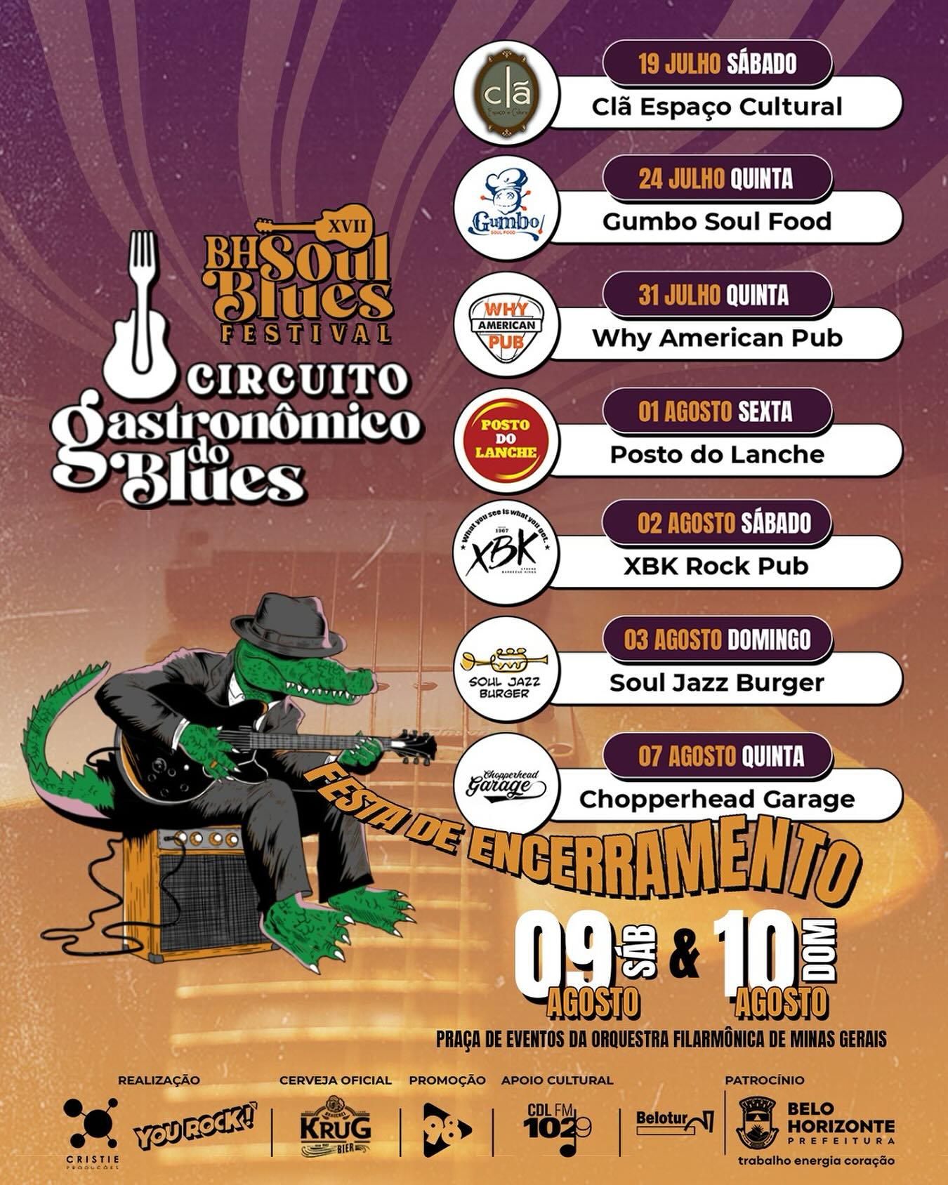 Um dos pontos altos é o Circuito Gastronômico, que, até 07 de agosto, leva a alguns bares e restaurantes de BH shows de Blues, Soul e Jazz. Cada um dos participantes apresenta um prato que será julgado e escolhido como “o melhor petisco do BH Soul Blues Festival”, por votação na internet e um júri especialmente convidado pelo Festival.