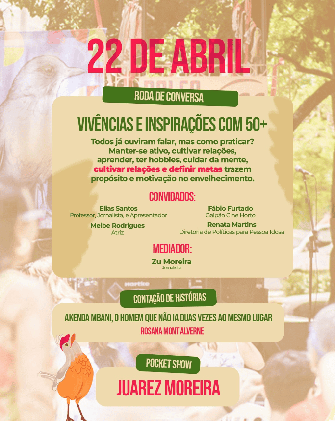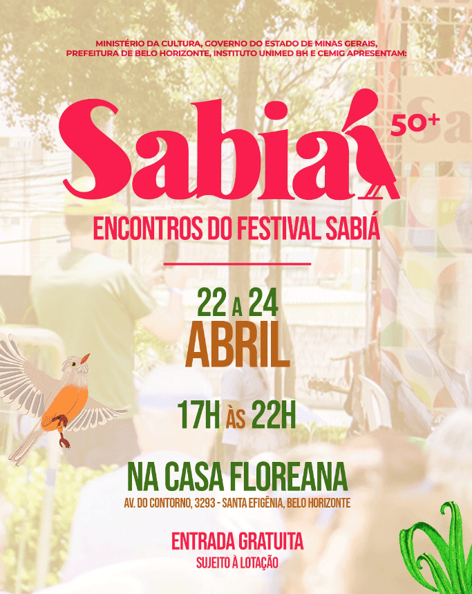 O Festival Sabiá chega à sua 4ª edição, ocupando a Casa Floreana e a Praça Floriano Peixoto, em Santa Efigênia – BH, entre os dias 22 e 27 de abril. Com entrada gratuita, o evento celebra a potência criativa de artistas 50+, reunindo mais de 20 atrações em uma programação diversa que inclui música, teatro, cinema, exposições, oficinas e rodas de conversa.