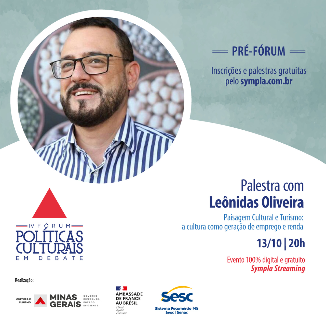 Dando início a uma série de eventos que formam o IV Fórum de Políticas Culturais em Debate, o Sesc em Minas, o Governo do Estado de Minas Gerais e a Embaixada da França no Brasil promovem o Pré-Fórum, ciclo de palestras com convidados especiais para falar sob o tema central do Fórum em 2020: Desafios da Produção Cultural em Tempos de Pandemia. Neste segundo encontro, o convidado será Leônidas Oliveira, com o tema Paisagem Cultural e Turismo: a cultura como geração de emprego e renda.