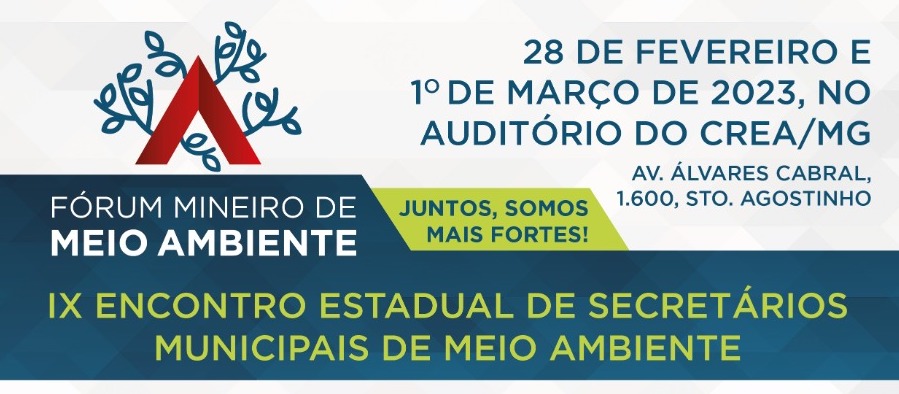 Gestores de meio ambiente de todo o Estado têm encontro marcado no 1º Fórum Mineiro de Meio Ambiente, de 28 de fevereiro a 1º de março de 2023, no Crea-MG. Promovido pela Associação Mineira de Municípios (AMM), o Fórum abre maratona de eventos técnicos da AMM em 2023. Dentro do Fórum, acontecerá, também, o IX Encontro Estadual de Secretários Municipais de Meio Ambiente.