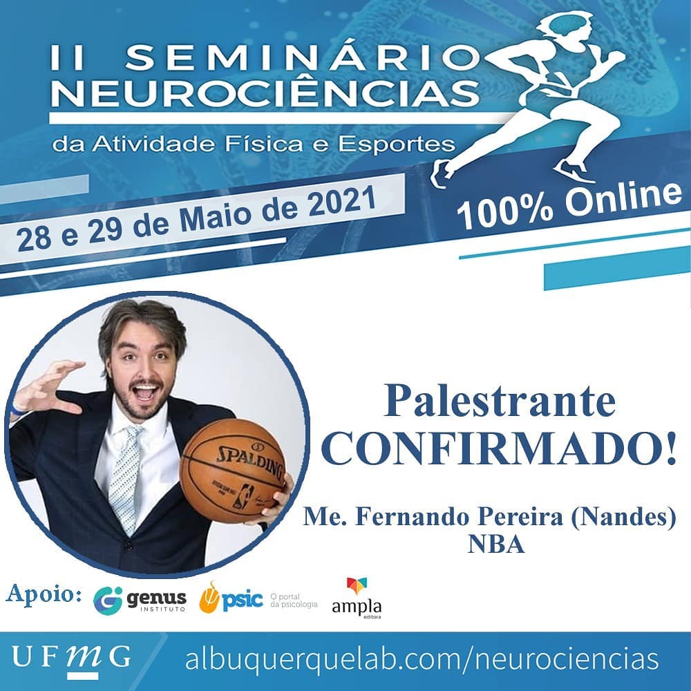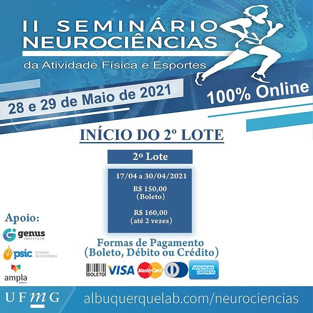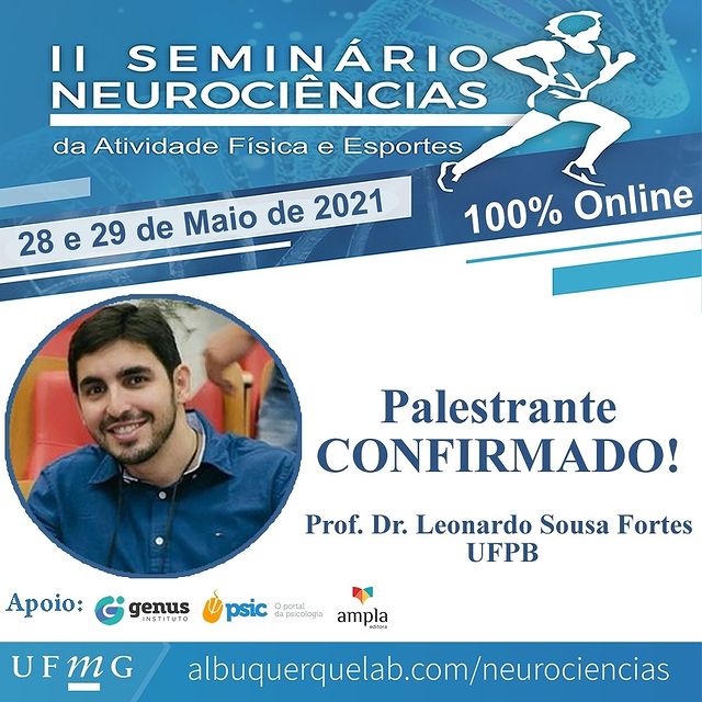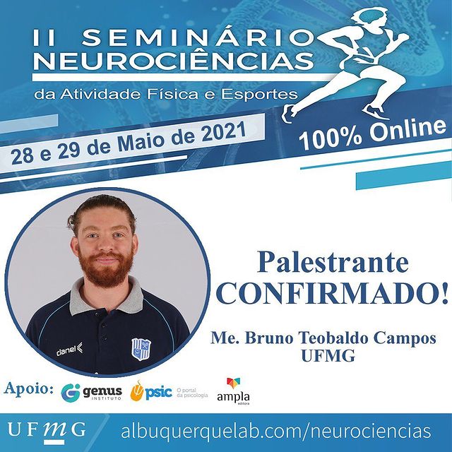 Nos dias 28 e 29 de Maio de 2021 o Grupo de Estudos e Pesquisas em Neurociências da Atividade Física e Esportes da Escola de Educação Física, Fisioterapia e Terapia Ocupacional da Universidade Federal de Minas Gerais estará recebendo uma série de convidados especiais para apresentar e debater temáticas que buscam a interação entre as Neurociências com a Atividade Física e os Esportes em um formato 100% Online.