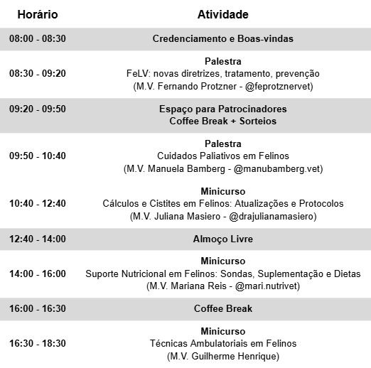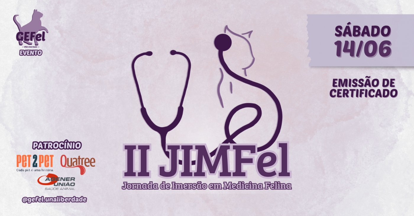 Este evento ocorrerá no dia 14/06, com duração de 08:00 às 17:30, onde alunos de medicina veterinária de diferentes universidades da região metropolitana de Belo Horizonte terão a oportunidade de participar de palestras e minicursos de temas relevantes para médicos veterinários atuarem na área de medicina felina.