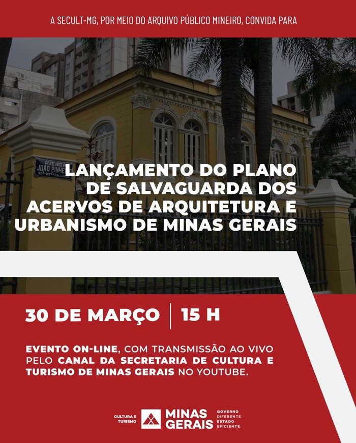 Na próxima terça-feira (30/03), a Secult, por meio do Arquivo Público Mineiro, lançará o Plano de Salvaguarda dos Acervos de Arquitetura e Urbanismo de Minas Gerais. O plano, elaborado em parceria com o IAB/MG, o CAU/MG, o IEPHA e a UFMG, consiste em um conjunto de ações visando a aprimorar a governança, a preservação e a difusão desses acervos essenciais para a proteção dos conjuntos arquitetônicos e urbanísticos do Estado.