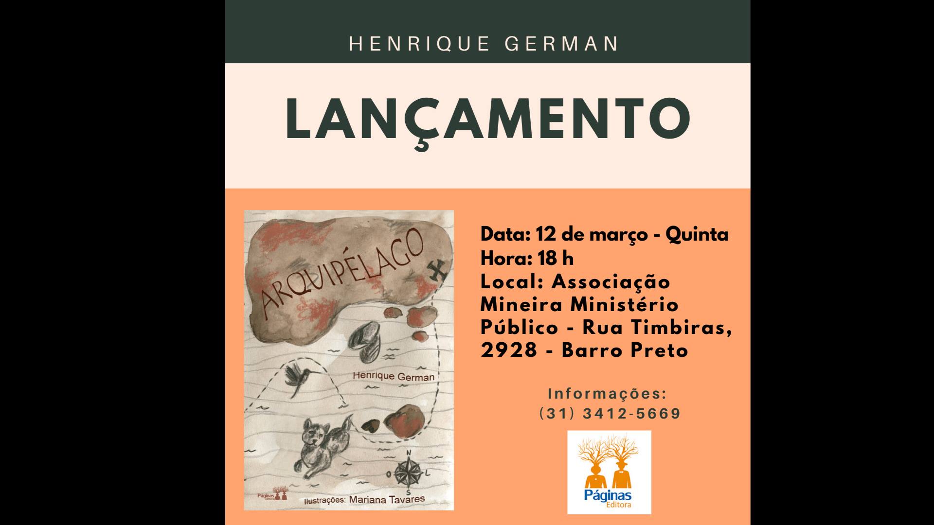 Histórias cotidianas, inquietações, registros de observações, situações da vida. Em Arquipélago, livro de estreia de Henrique German, o autor transpõe para o papel um pouco do que viu e aprendeu, de vivência e de leitura. A obra será lançada, pela Páginas Editora, no próximo dia 12 de março, às 18h, na Associação Mineira do Ministério Público, em Belo Horizonte. Advogado e membro aposentado do Ministério Público de Minas Gerais, Henrique German sempre foi um leitor voraz. Em 2019, após perder parcialmente a visão, devido a uma doença, ele passou a escrever.
