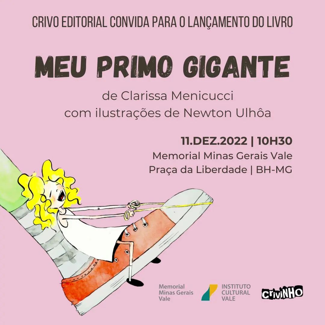 O livro "Meu Primo Gigante", de Clarissa Menicucci, com ilustrações de Newton Ulhôa, será lançado no Memorial Vale, na Sala de Leitura, às 10h30, do domingo, dia 11 de dezembro.