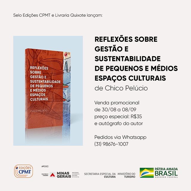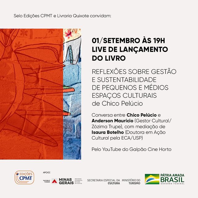 Quarta-feira, 01/09, às 19h, rola a live de lançamento do livro "Reflexões sobre gestão e sustentabilidade de pequenos e médios espaços culturais", escrito por Chico Pelúcio. No encontro vão estar o próprio Chico, diretor geral do Galpão Cine Horto, Anderson Maurício, da Zózima Trupe, com mediação de Isaura Botelho, que é doutora em ação cultural pela ECA/USP.