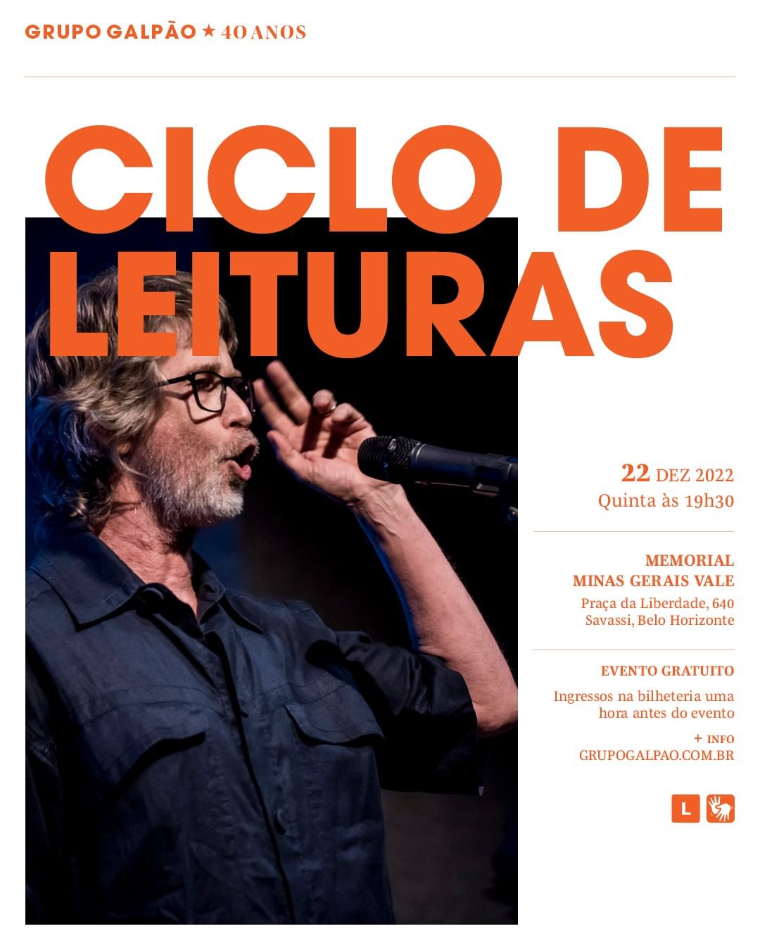Na próxima Quinta-Feira, dia 22/12, acontecerá o último Ciclo de Leitura, no Memorial Minas Gerais Vale. O evento possui entrada gratuita, tem início às 19h30 e é acessível em Libras! Os ingressos podem ser retirados na bilheteria a partir de 1h de antecedência, sujeito à lotação.