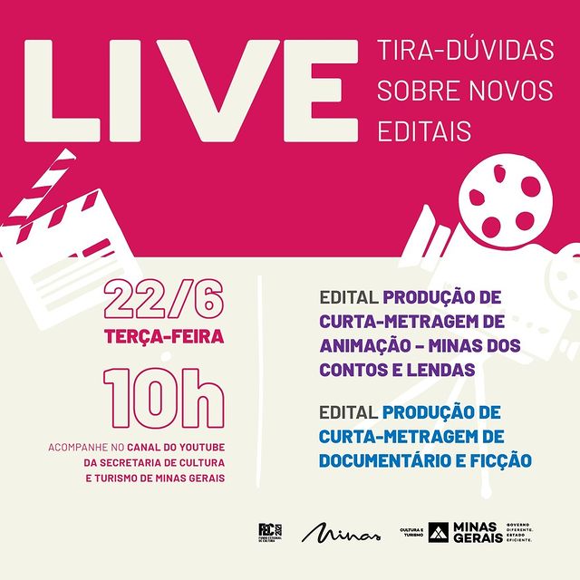 Terça-feira (22/6), às 10h, vai acontecer uma live tira-dúvidas sobre os editais “Produção de curta-metragem de animação” e “Produção de curta-metragem de documentário e ficção” no canal do YouTube da Secult. É o momento de tirar todas as suas dúvidas para não perder essa oportunidade!