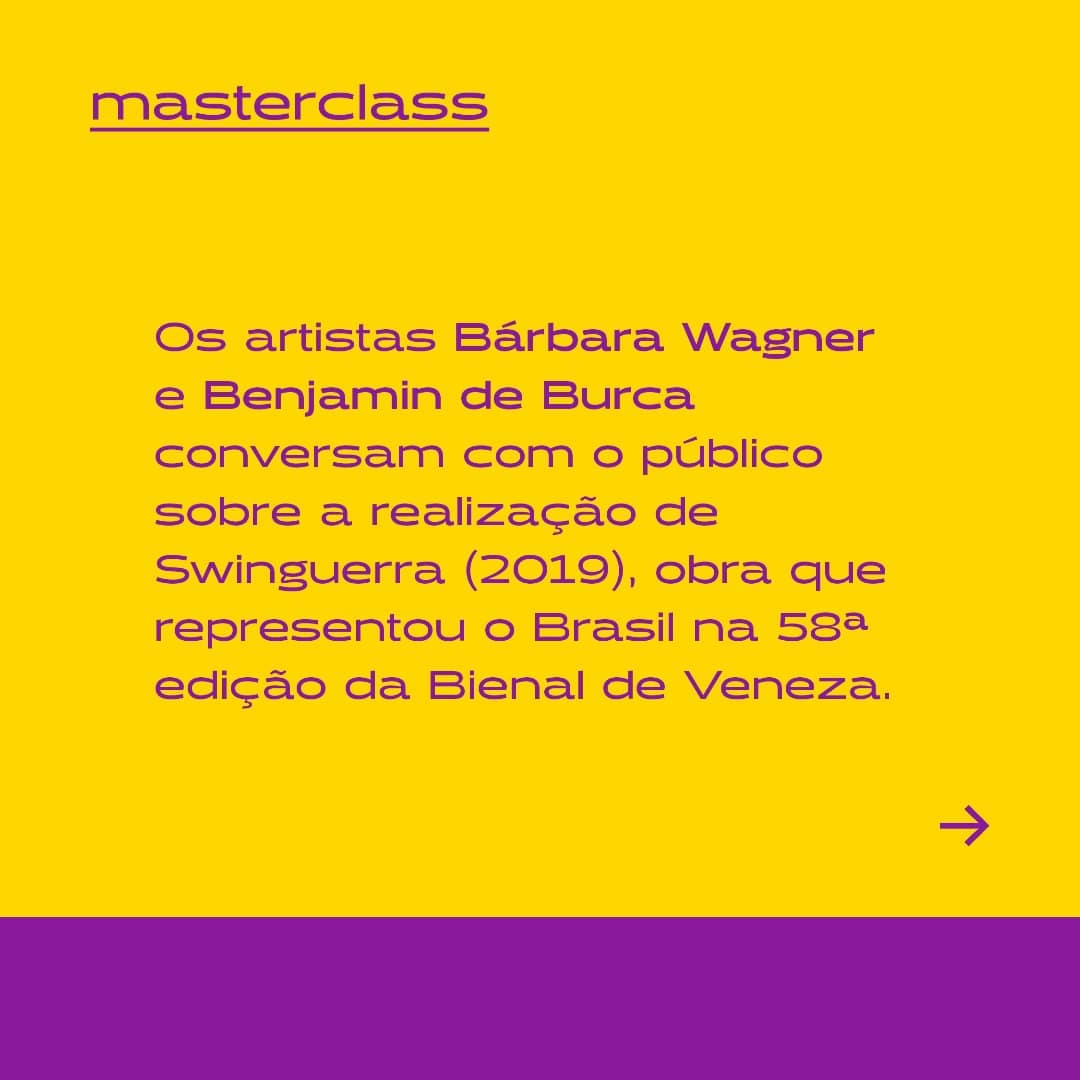 Dia 04 de novembro, às 15h, os artistas Bárbara Wagner e Benjamin de Burca conversam com o público sobre a realização do filme Swinguerra (2019), obra que representou o Brasil na 58ª edição da Bienal de Veneza.