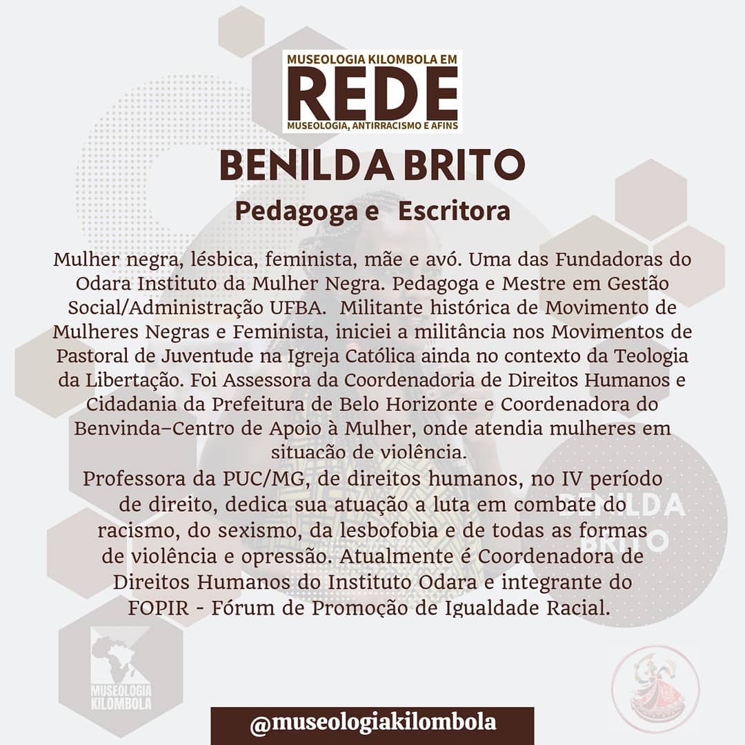 Nesta terça-feira a Rede Museologia Kilombola convida a Pedagoga e Mestre em Gestão Social/Administração, BENILDA BRITO para conversar sobre o racismo na escola como forma de desumanização e muitas vezes como espaço conivente dessas práticas, além do silêncio pedagógico presente entre os educadores, mesmo a implementação da lei de 2003.
