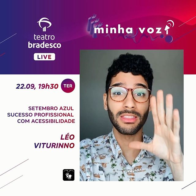 Léo Viturinno (@leoviturinno), YouTuber e influenciador surdo especialista em Libras, lhe convida para fortalecer ainda mais esse Setembro Azul, com um bate-papo sobre ‘Sucesso profissional com acessibilidade’. Terça-feira (22), às 19h30, no perfil do Instagram do @teatrobradesco.