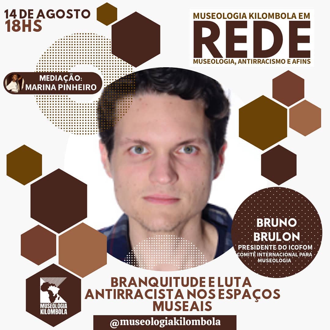 Nesta sexta-feira, convidamos o museólogo BRUNO BRULON, Presidente do Comitê Internacional de Museologia do Conselho Internacional de Museus (ICOFOM), para debater conosco sobre o papel da branquitude na luta antirracista no contexto das instituições museais.