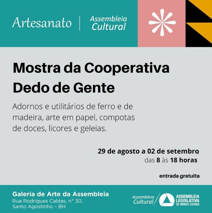 No dia 29 de Agosto, será a abertura da mostra de artesanato da Cooperativa Dedo de Gente, de Curvelo (MG), na Assembleia Cultural.