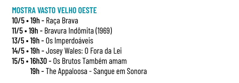 De 4 a 31 de maio o Cine Santa Tereza exibe a mostra Vasto Velho Oeste, que traz uma seleção de faroestes clássicos e atuais, de diretores como John Ford, Howard Hawks, Robert Altman, Sérgio Leone, Sam Peckinpah, Sydney Pollack, Clint Eastwood, Henry Hathaway, George Stevens, Fred Zinnemann, Ethan e Joel Coen, Andrew Dominik, dentre outros.