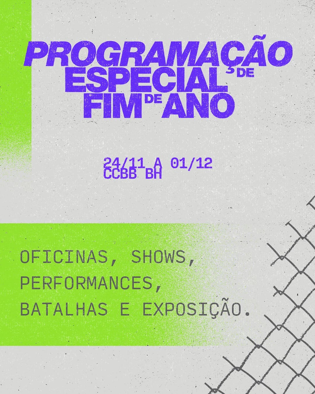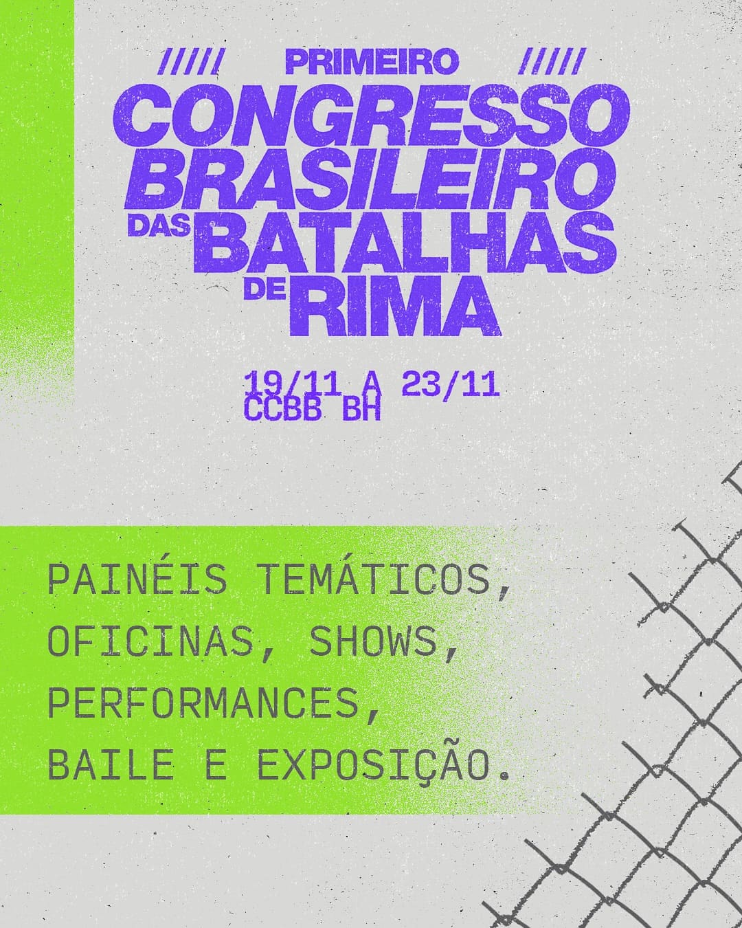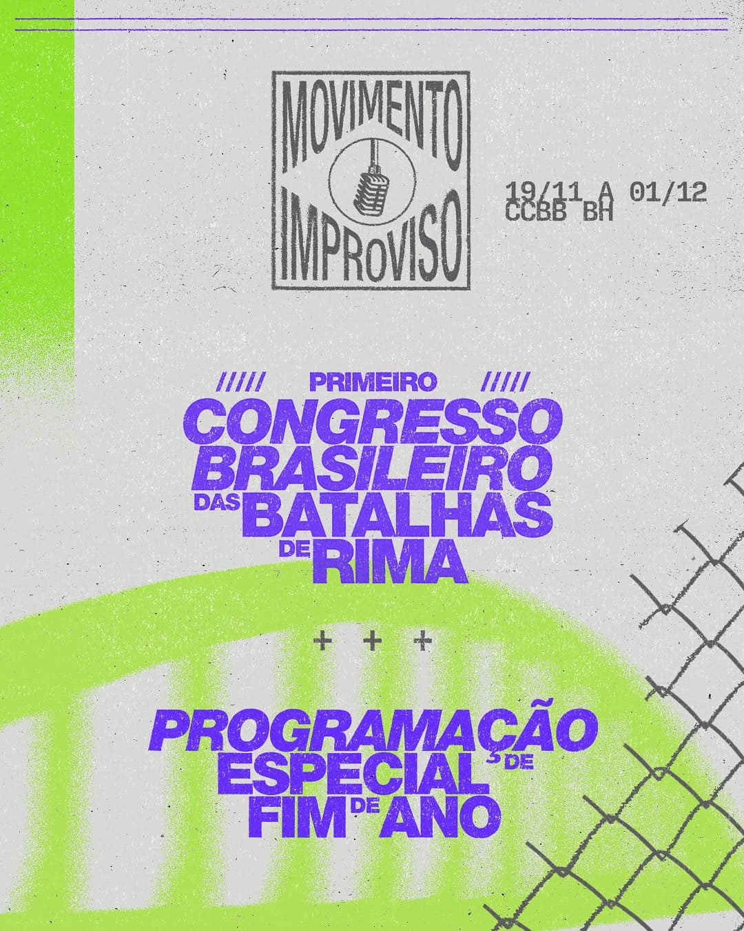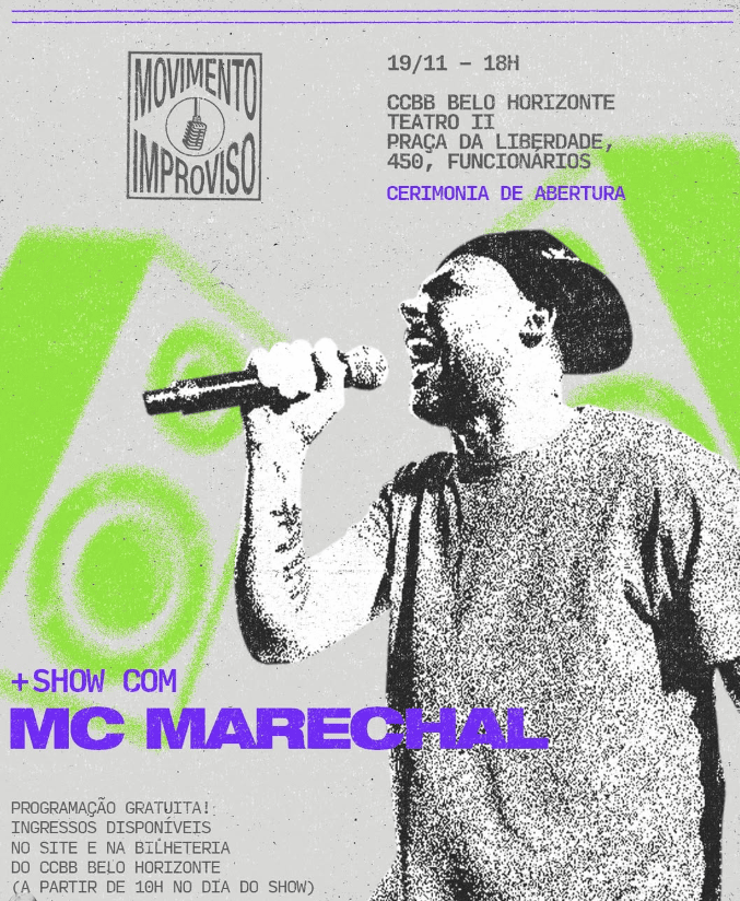 Promovido pela Família de Rua, o Movimento Improviso é uma mostra cultural gratuita que ocupará o CCBB Belo Horizonte entre 19 de novembro e 1º de dezembro, de quarta a segunda-feira. A iniciativa integra o Primeiro Congresso Brasileiro das Batalhas de Rima, além de compor a programação especial de fim de ano da Família de Rua. O evento celebra os 20 anos das batalhas de MCs no Brasil, reunindo artistas, coletivos, organizações e representantes de diversas regiões do país.