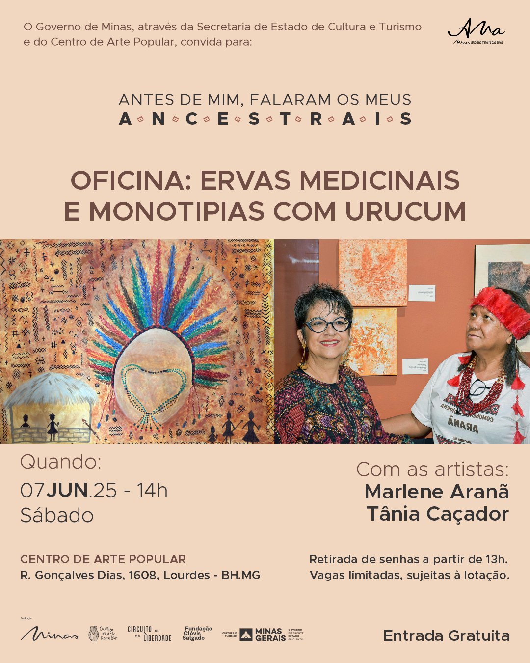 A oficina, que integra o AMA – Ano Mineiro das Artes, convida o público a explorar os usos medicinais de plantas tradicionais e a experimentar a técnica da monotipia utilizando urucum, corante natural carregado de simbolismo nas culturas indígenas.