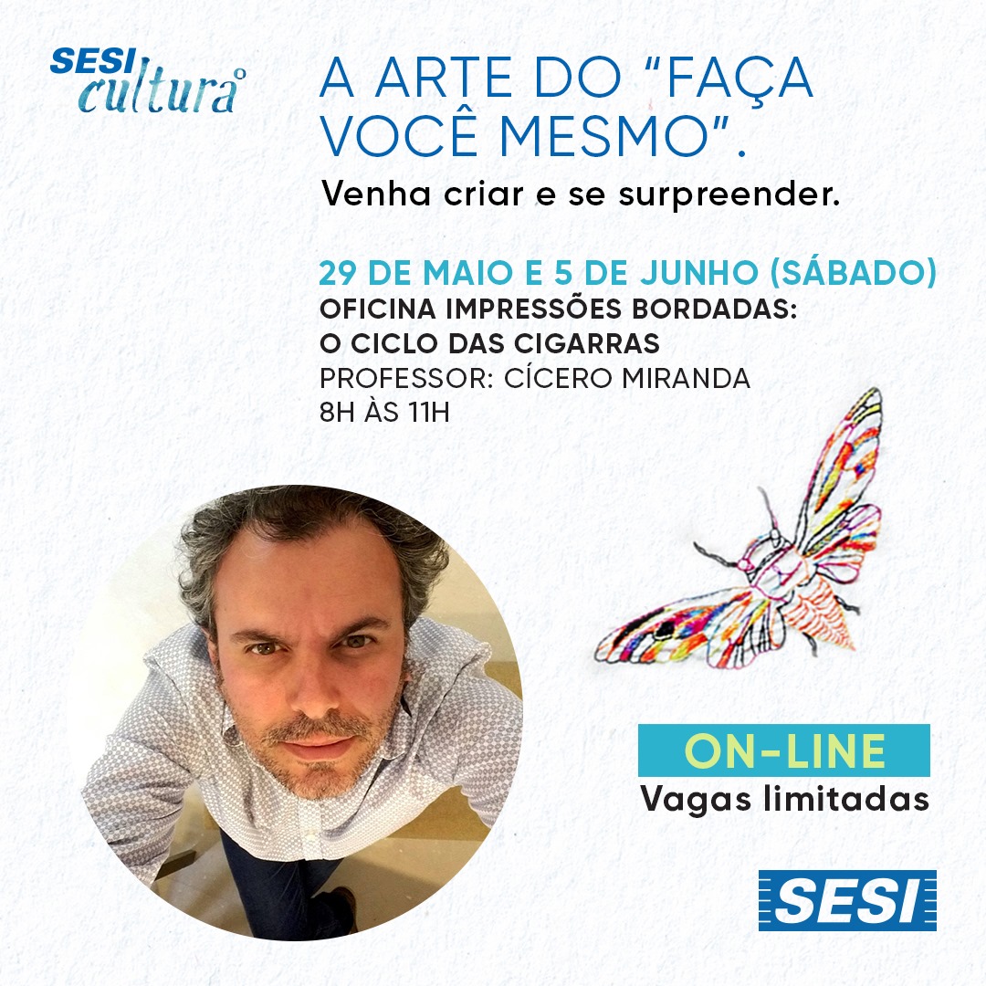 O curso propõe a elaboração de bordados livres, à partir de desenhos científicos e fotografias, das diversas fases do ciclo de vida das cigarras. O bordado, além de ser uma ótima atividade manual, ajuda a reduzir o estresse e melhorar a concentração.