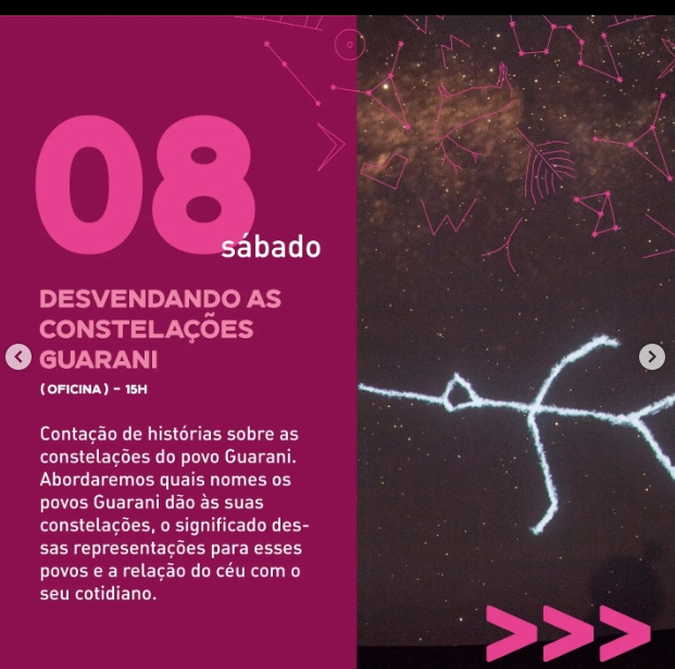 A oficia é uma contação de histórias sobre as constelações do povo Guarani. Na atividade, são abordados os nomes que os povos Guarani dão às suas constelações, o significado dessas representações e a relação do céu com o seu cotidiano.