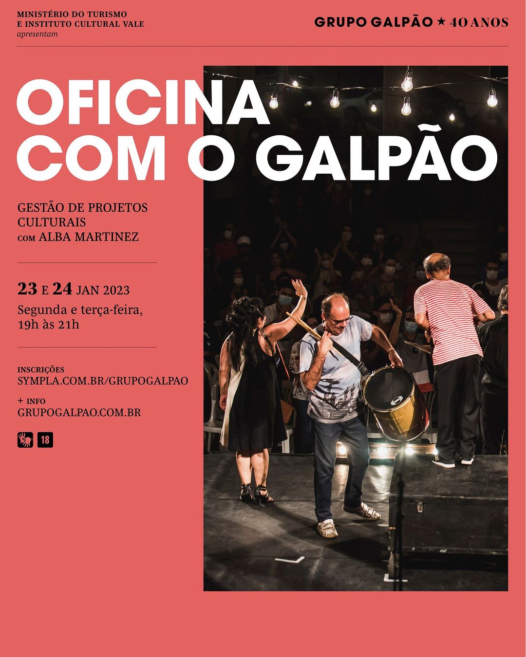 Nos dias 23 e 24 de janeiro, segunda e terça-feira, de 19h às 21h, o Grupo Galpão irá promover oficinas virtuais de Gestão de Projetos Culturais" com Alba Martinez, coordenadora de planejamento.