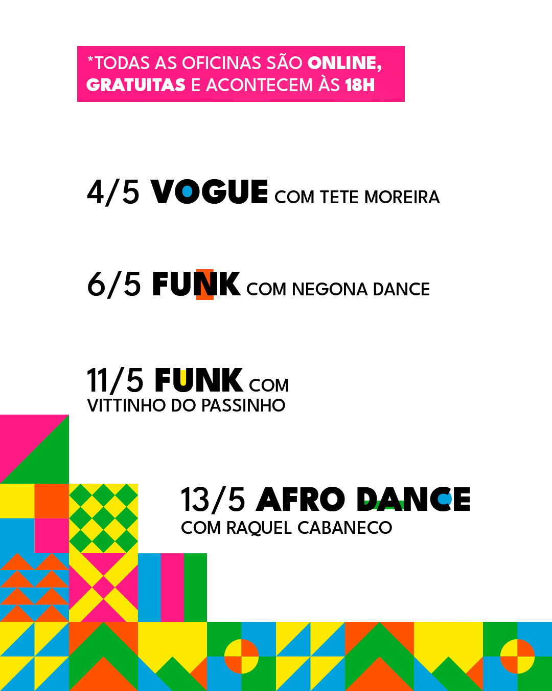 Serão realizadas dez oficinas virtuais de dança de 4 de maio a 3 de junho, sempre às terças e quintas-feiras, que vão dar destaque às manifestações artísticas da comunidade do Centro Cultural, como o funk, vogue, afro dance, house e maculelê, além da dança contemporânea e subjetiva.