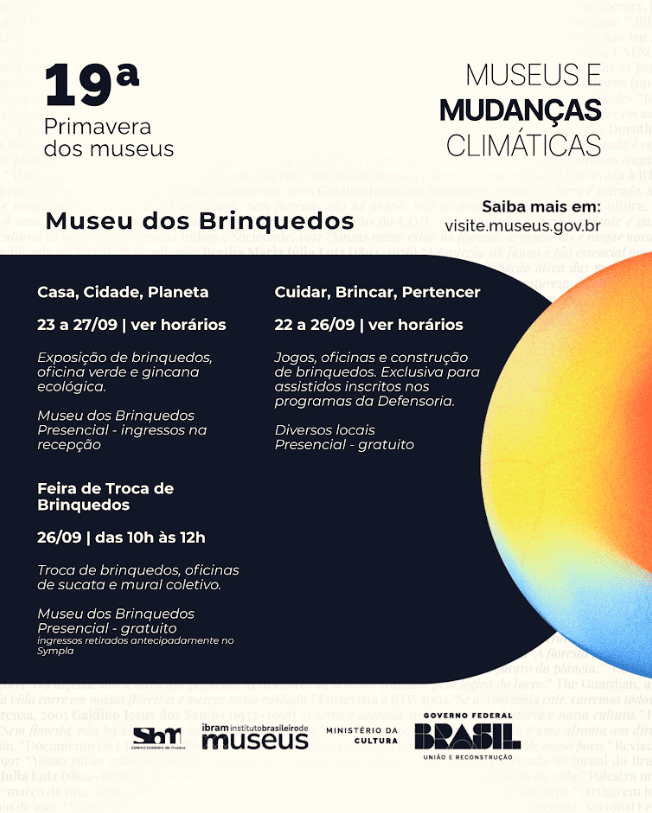 Entre os dias 22 e 27 de setembro, o espaço reafirma seu papel como lugar de preservação do passado, significação do presente e projeção do futuro. Ao entrelaçar memória cultural, justiça social e criatividade lúdica, o museu transforma o brincar em linguagem crítica e criativa para enfrentar a crise climática.