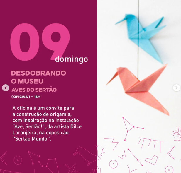 A oficina é um convite para a construção de origamis (dobraduras em papel), com inspiração na instalação “Ave, Sertão!”, da artista Dilce Laranjeira, na exposição virtual ”Sertão Mundo”.