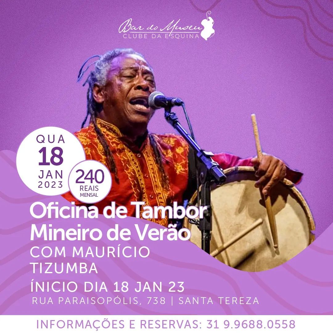 Nesta próxima quarta-feira (18/01), às 19h, o Bar do Museu Clube da Esquina receberá Tizumba para uma oficina Tambor Mineiro de Verão.