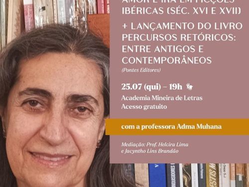 No dia 25 de julho, quinta-feira, às 19h, a professora Adma Muhana propõe a palestra “Amor e ira em ficções ibéricas (séculos XVI e XVII)” que terá participação do presidente da AML e emérito da FALE/UFMG, Jacyntho Lins Brandão, sob mediação da professora Helcira Lima (FALE/UFMG, ex-presidente da SBR). O dia também contará com a Adma Muhana, onde ela assinará o prefácio de obra lançada na ocasião, intitulada “Percursos retóricos: entre antigos e contemporâneos”, organizada por Helcira Lima e Maria Cecília Coelho. O evento é gratuito, sem necessidade de inscrição prévia, e conta com interpretação em Libras.