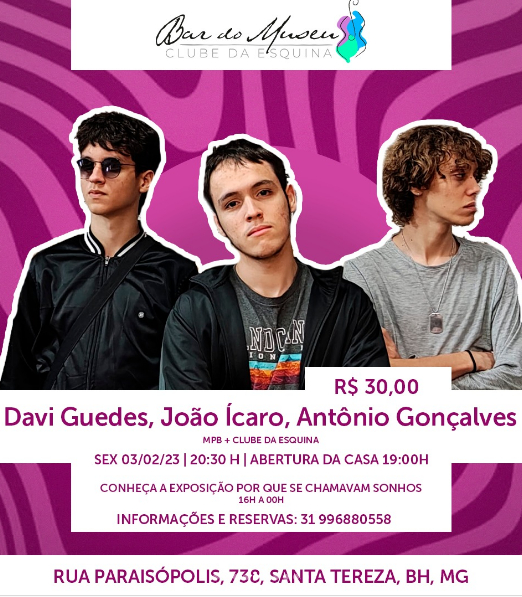 03/02 (sexta-feira) - 20:30h - Davi Guedes, João Ícaro e Antônio Gonçalves