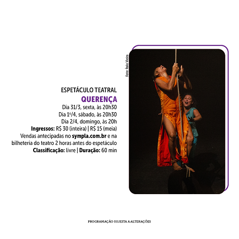 Dias 31/03, 01/04 e 02/04, Sexta e Sábado às 20h30 e Domingo às 20h.