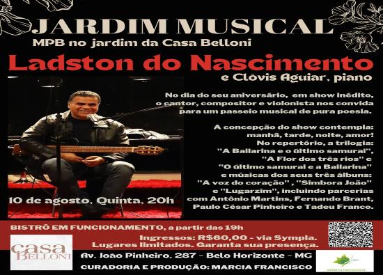 O projeto Jardim Musical recebe o cantor, compositor e violonista, Ladston do Nascimento, no dia 10 de agosto, quinta-feira, às 20h, na Casa Belloni.