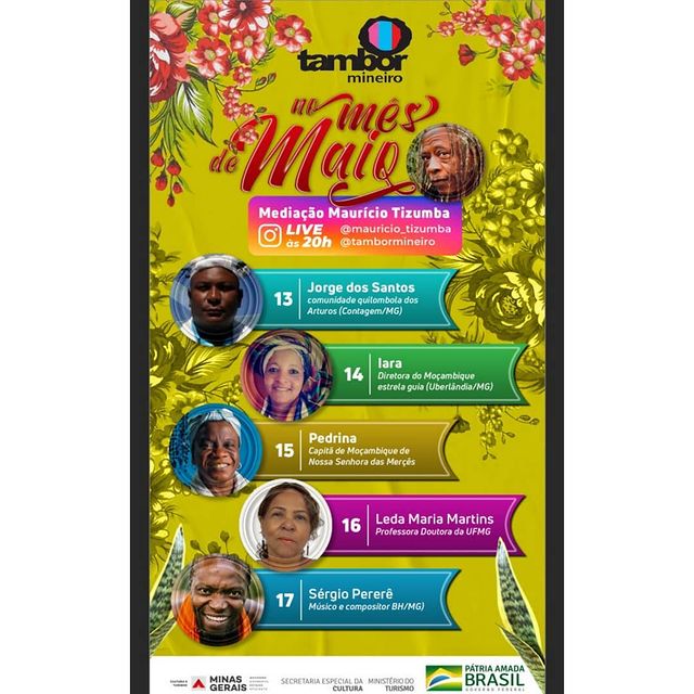 A programação se inicia no dia 13, com a presença do Capitão Jorge dos Santos, da comunidade quilombola dos Arturos (Contagem/MG) e prossegue com a Capitã Pedrina (Oliveira/MG) dia 14/05, Iara, diretora do Moçambique estrela guia (Uberlândia/MG) e a Professora Doutora da UFMG Leda Maria Martins (Belo Horizonte/MG) no dia 16/05.