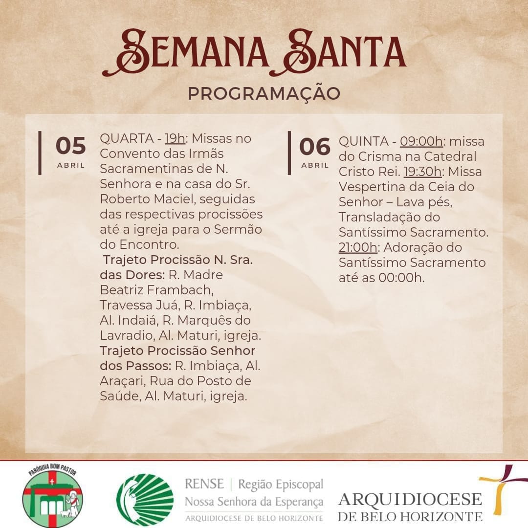 Missa da Ceia do Senhor - Lava Pés e Trasladação do Santíssimo Sacramento: 19h30