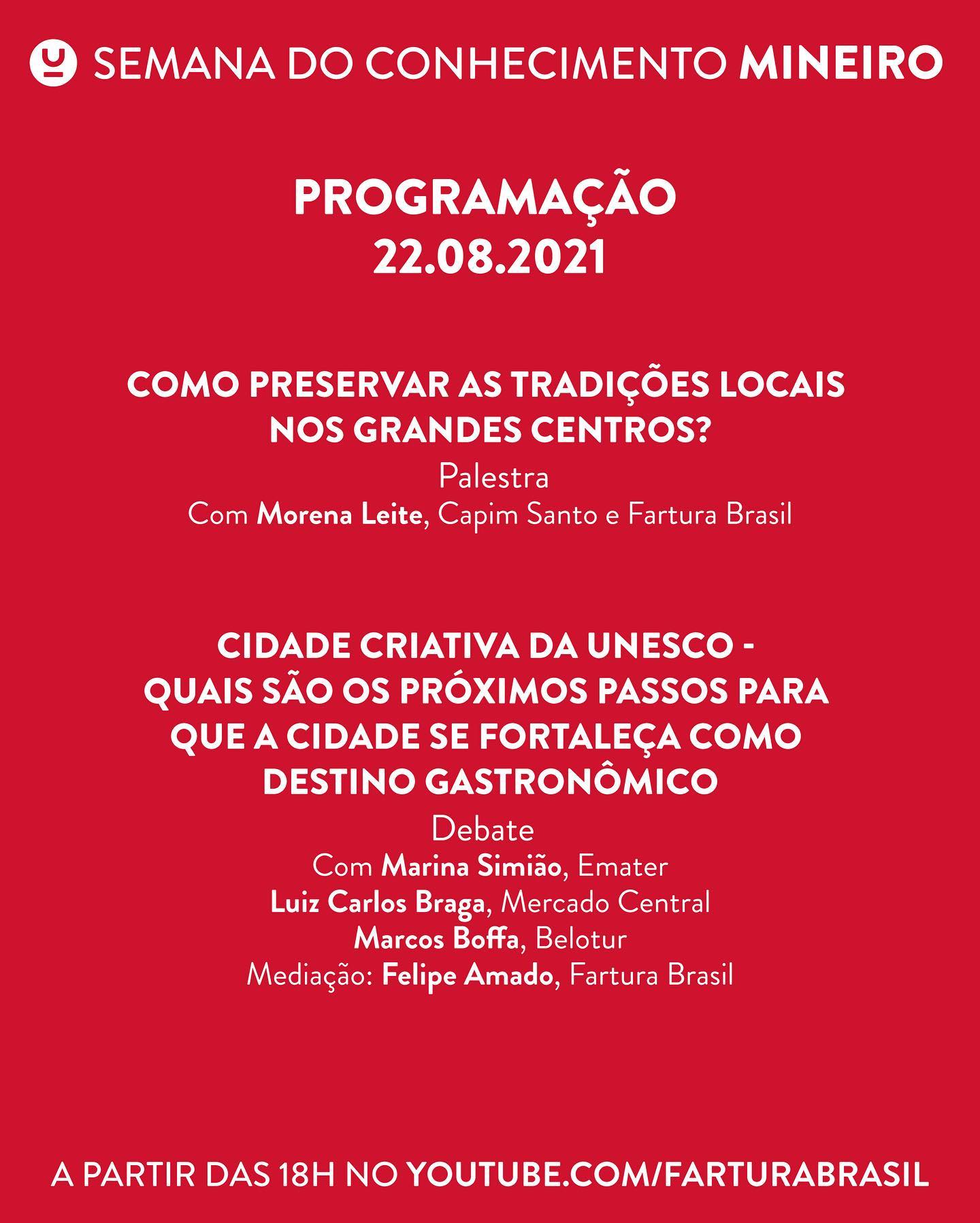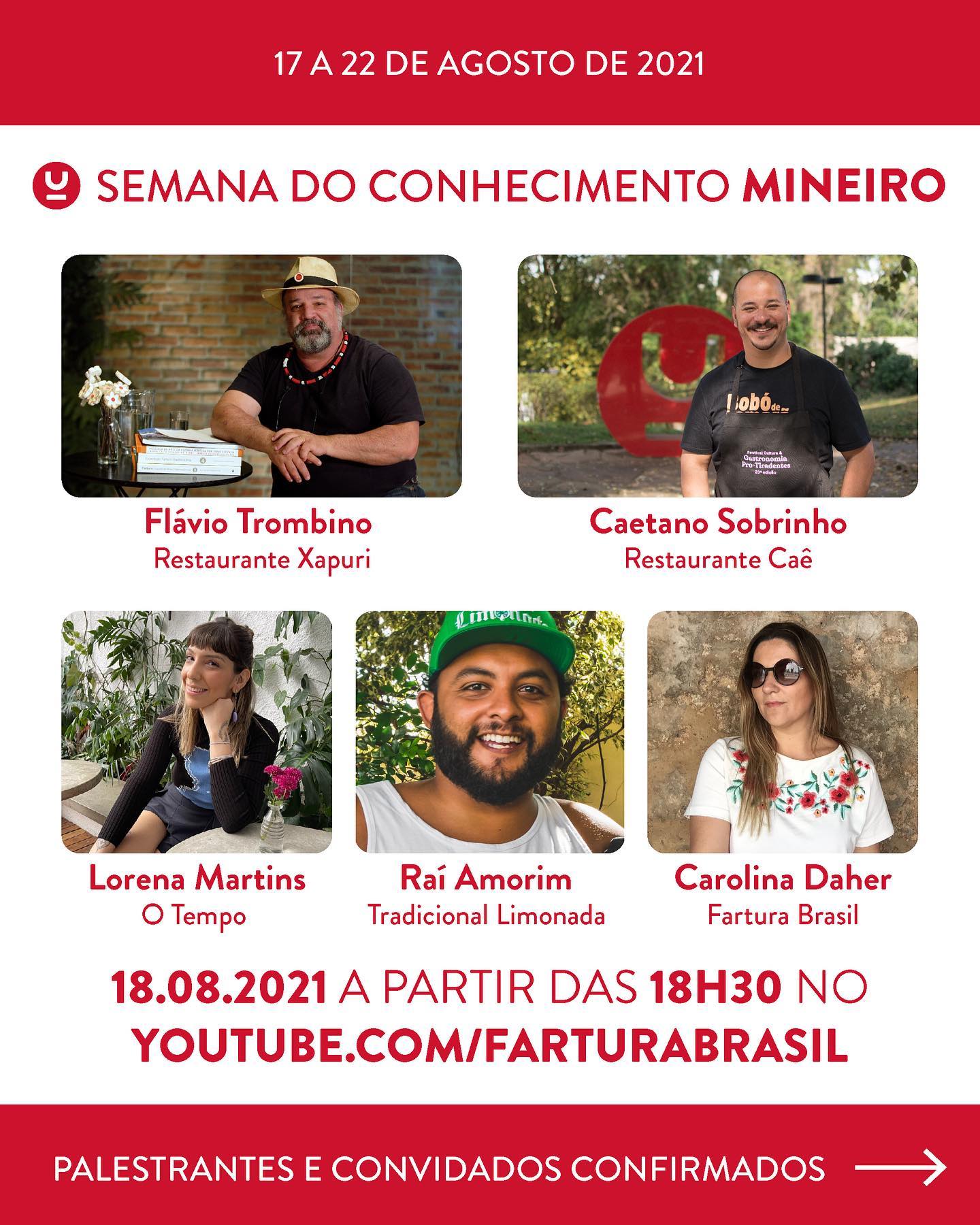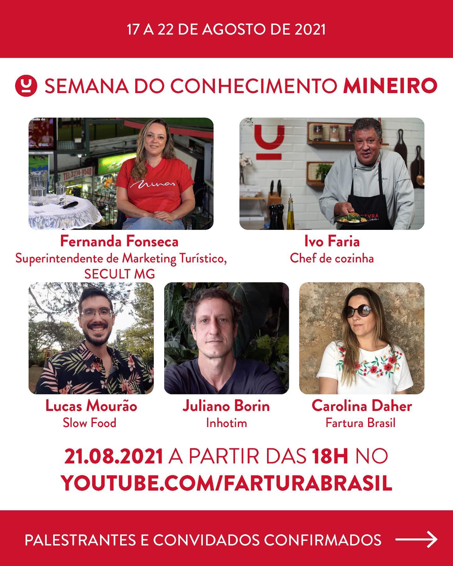 O Projeto Fartura – Comidas do Brasil realiza neste mês, a 2ª edição da Semana do Conhecimento Mineiro, que reúne profissionais renomados de diversas áreas para discutir a gastronomia mineira, o cenário da gastronomia atual e novas perspectivas. A programação é 100% virtual e gratuita, conta com palestras, mesas redondas e aulas-shows e pode ser acompanhada no YouTube do projeto entre os dias 17 e 22 de agosto de 2021.