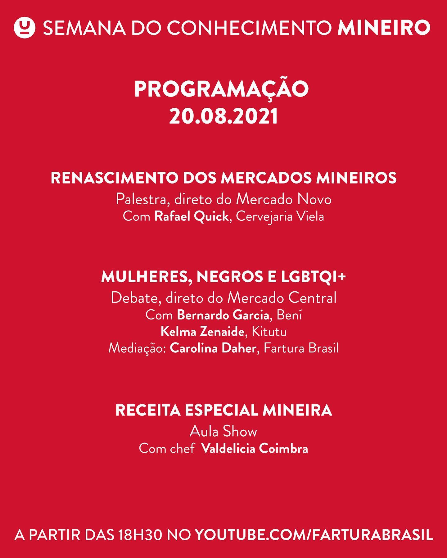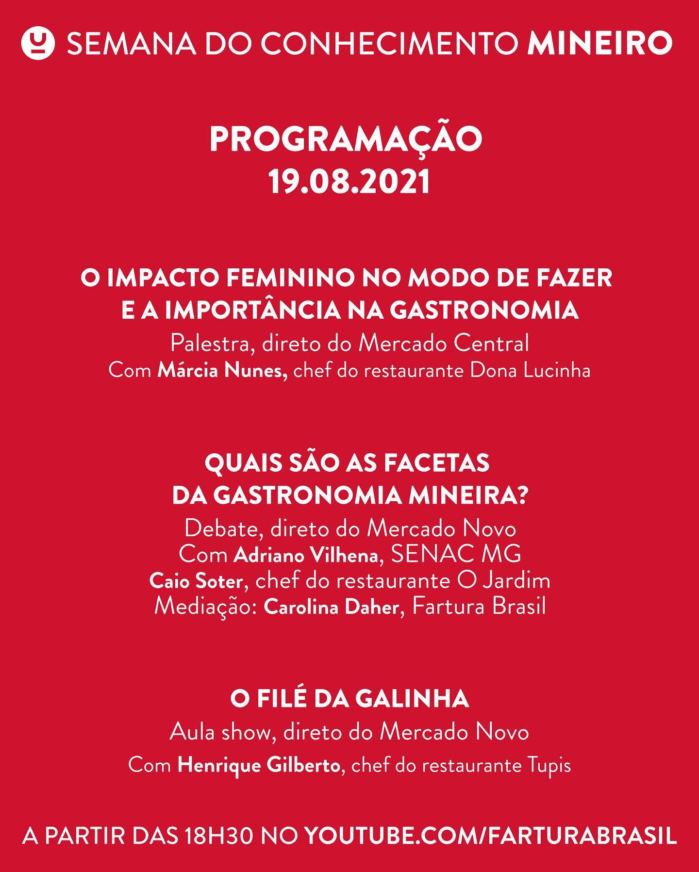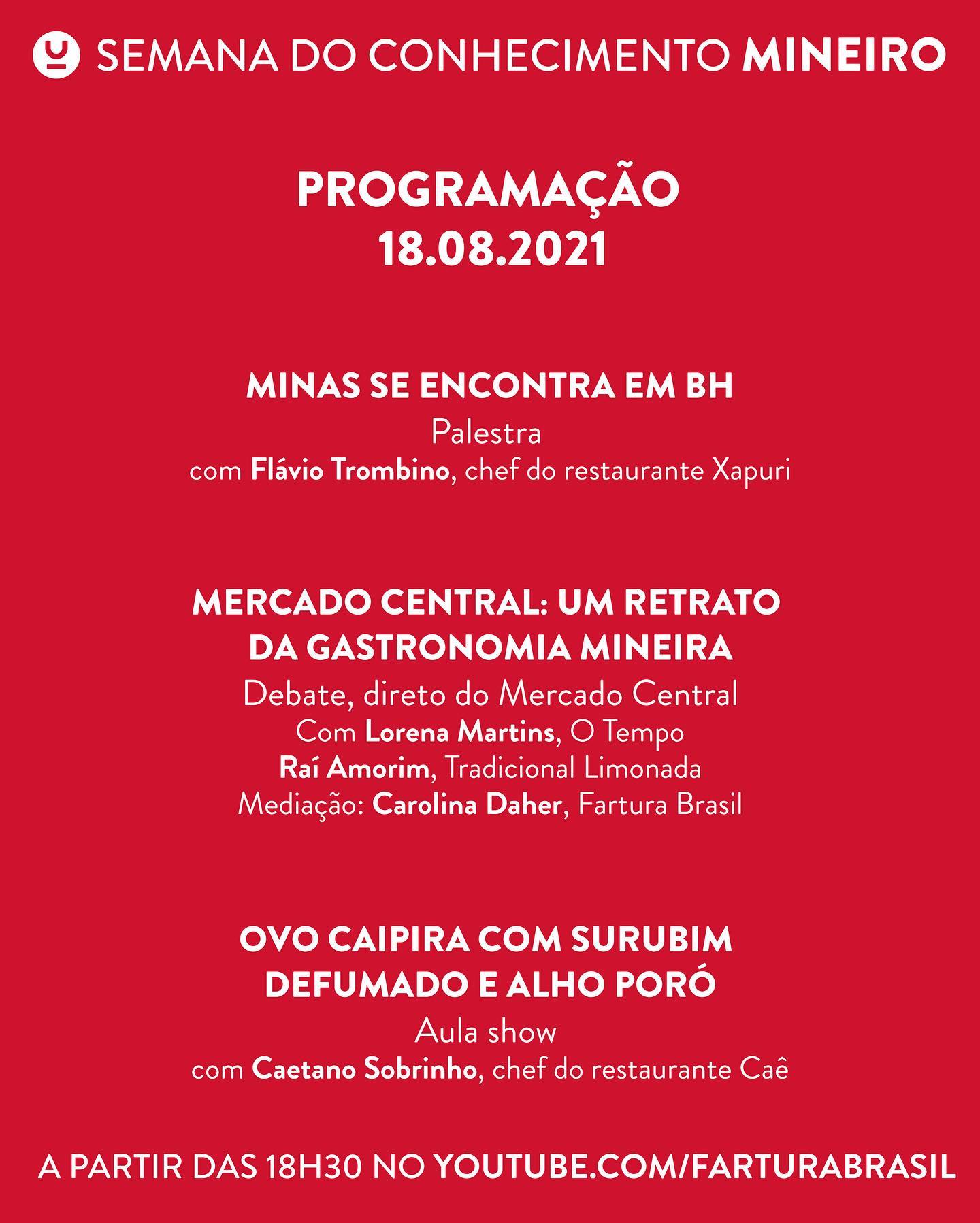 O Projeto Fartura – Comidas do Brasil realiza neste mês, a 2ª edição da Semana do Conhecimento Mineiro, que reúne profissionais renomados de diversas áreas para discutir a gastronomia mineira, o cenário da gastronomia atual e novas perspectivas. A programação é 100% virtual e gratuita, conta com palestras, mesas redondas e aulas-shows e pode ser acompanhada no YouTube do projeto entre os dias 17 e 22 de agosto de 2021.