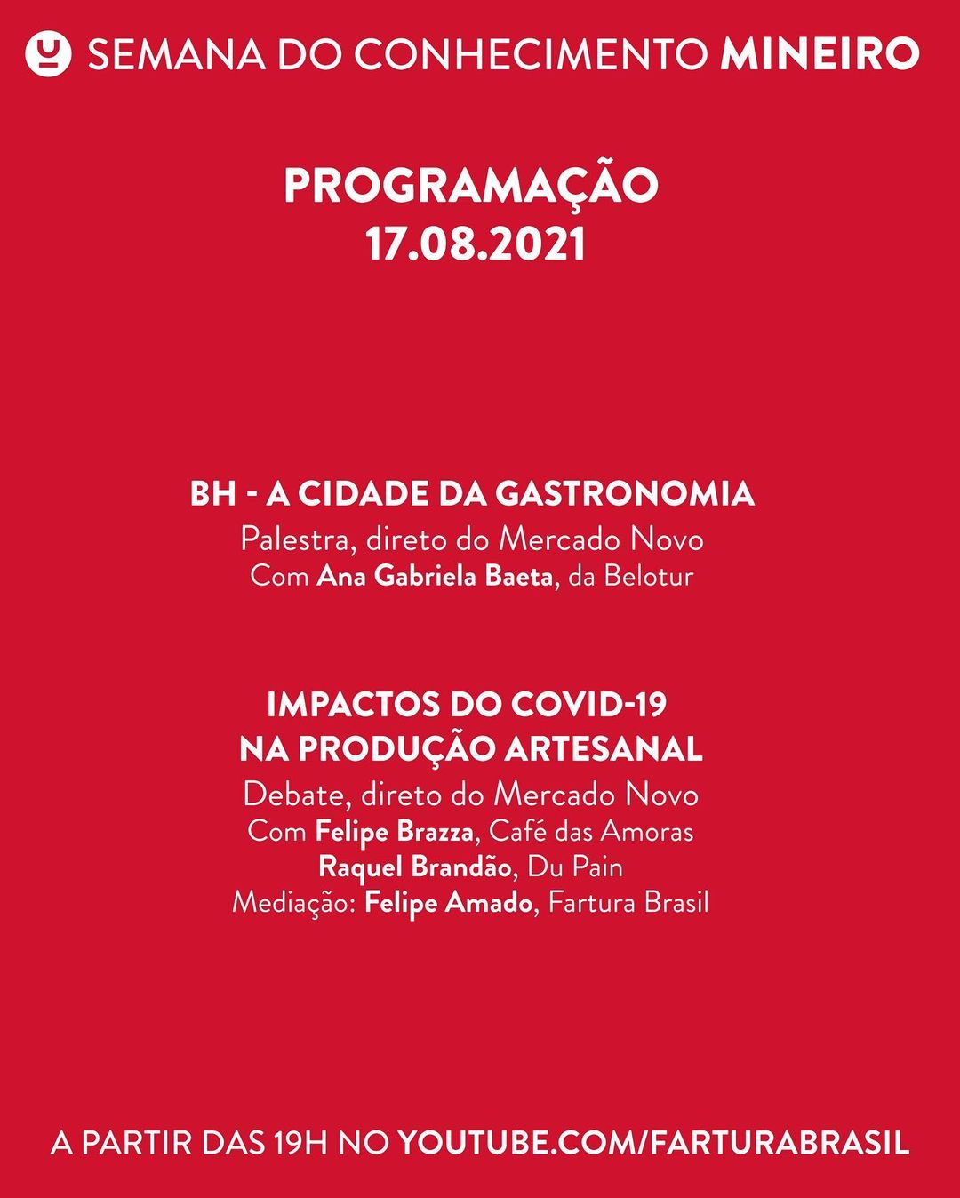 Dentre os temas também estão “Os impactos do Covid-19 na produção artesanal”, com os convidados Felipe Brazza (Café das Amoras) e Raquel Brandão (Du Pain), “Utilização de PANCs na alimentação”, com Lucas Mourão (Slow Food BH) e o curador botânico do Inhotim Juliano Borin. Para finalizar, a turismóloga Mariana Simião, o diretor superintendente do Mercado Central, Luiz Carlos Braga, e o diretor de políticas de turismo e inovação da Belotur, Marcos Boffa, falam sobre “Cidade Criativa da Unesco – Quais são os próximos passos para que a cidade se fortaleça como destino gastronômico”.