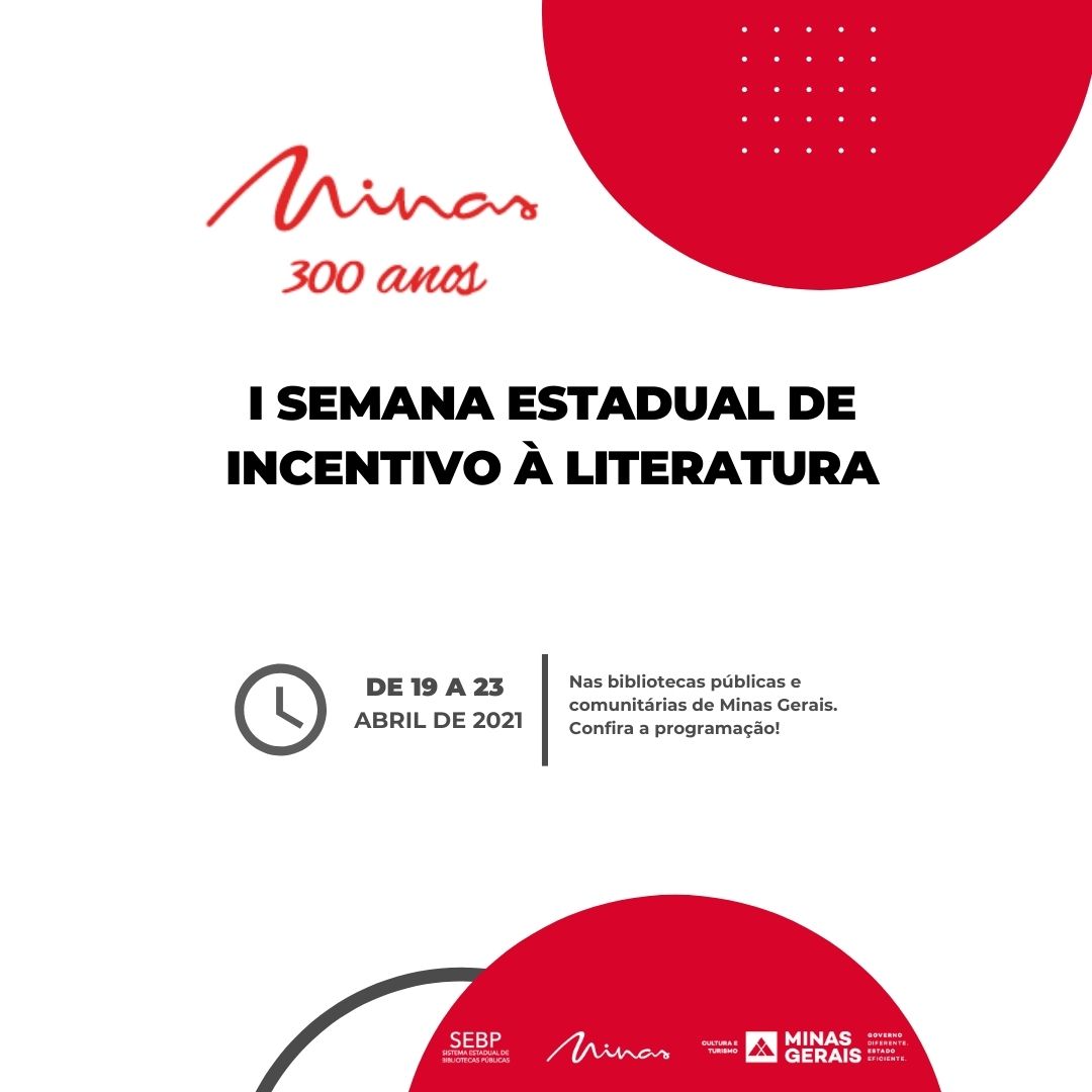 Iniciativa da Secretaria de Estado de Cultura e Turismo (Secult), por meio do Sistema Estadual de Bibliotecas Públicas de Minas Gerais (SEBPMG), o evento gratuito aborda a efeméride de 300 anos de Minas Gerais, com programação virtual variada, de 19 a 23 de abril, mesclando atividades virtuais e presenciais.