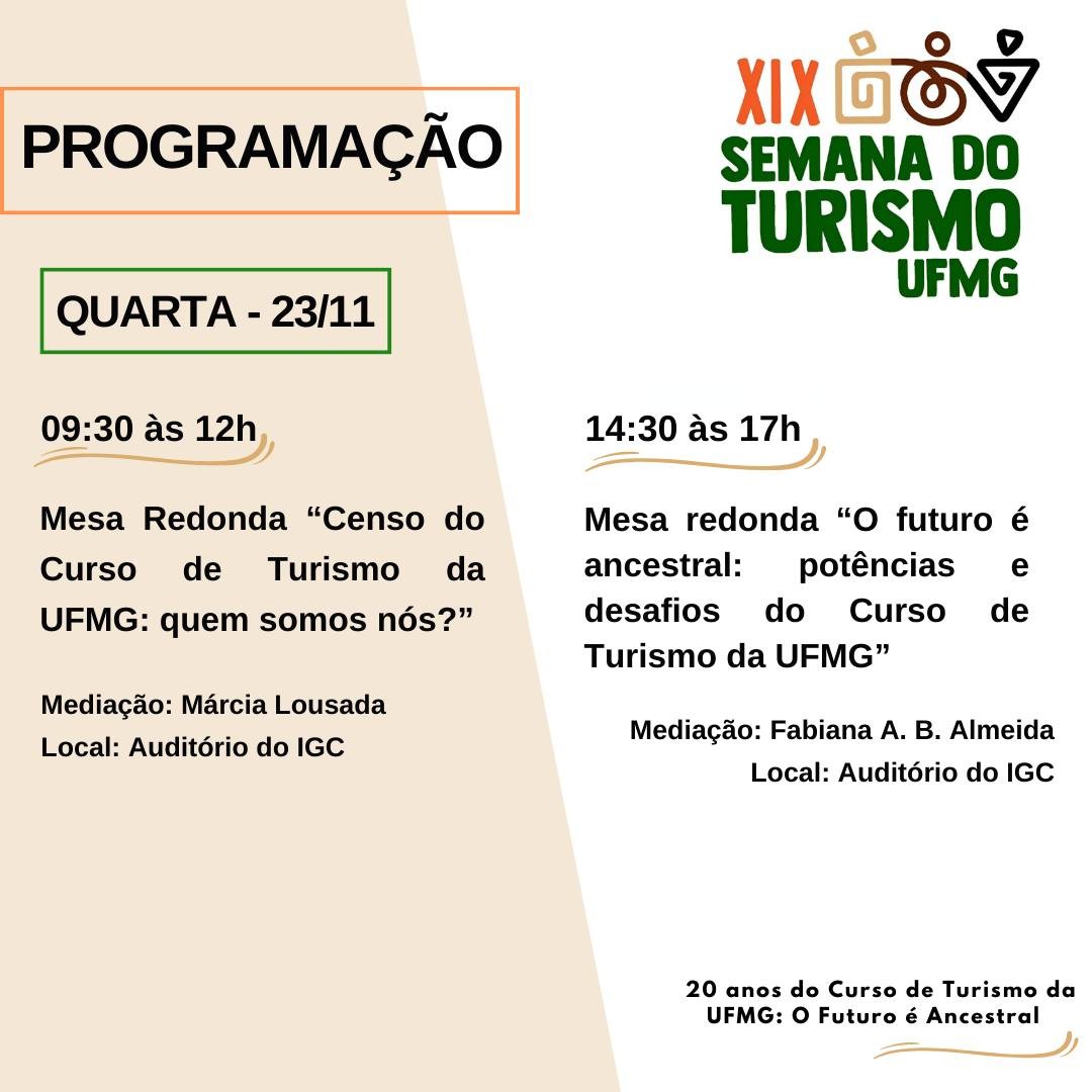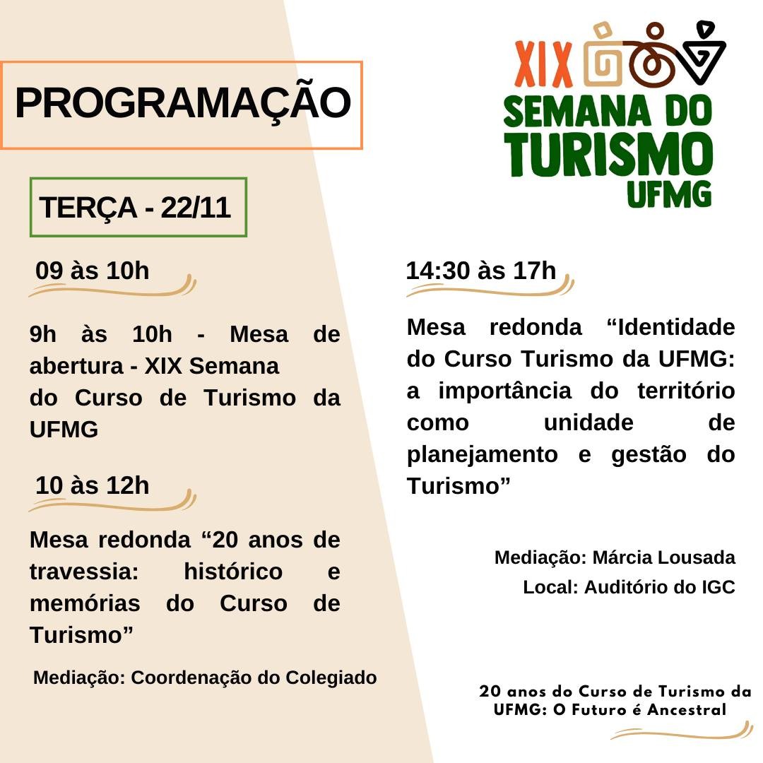 A 19ª Semana do Turismo, organizada pela Coordenação do Colegiado de Graduação em Turismo e a Território Empresa Júnior de Turismo (UFMG), abordará a temática “20 Anos do Curso de Turismo da UFMG: O Futuro é Ancestral”, trazendo para as mesas de diálogo abordagens como: a história e memória do curso de turismo ao longo destes 20 anos, sua identidade, o que nos diferencia e caracteriza, como surgiu o curso, projetos, iniciativas, desafios futuros e perspectivas, através da visão de ex-alunos, professores, ex-membros da Território empresa júnior e setor administrativo.
