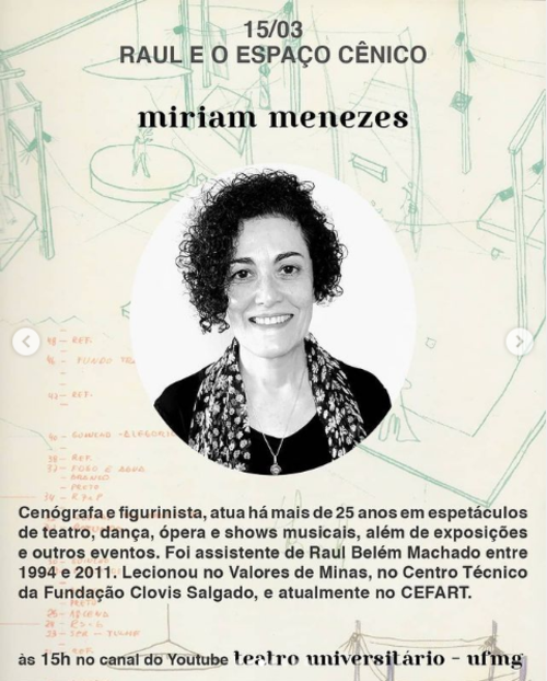 Miriam Menezes é cenógrafa e figurinista, atua há mais de 25 anos em espetáculos de teatro, dança, ópera e shows musicais, além de exposições e outros eventos. Foi cenógrafa assistente de Raul Belém Machado entre 1994 e 2011. Lecionou no Programa Valores de Minas, no Centro Técnico da Fundação Clovis Salgado, e atualmente no CEFART da mesma instituição.