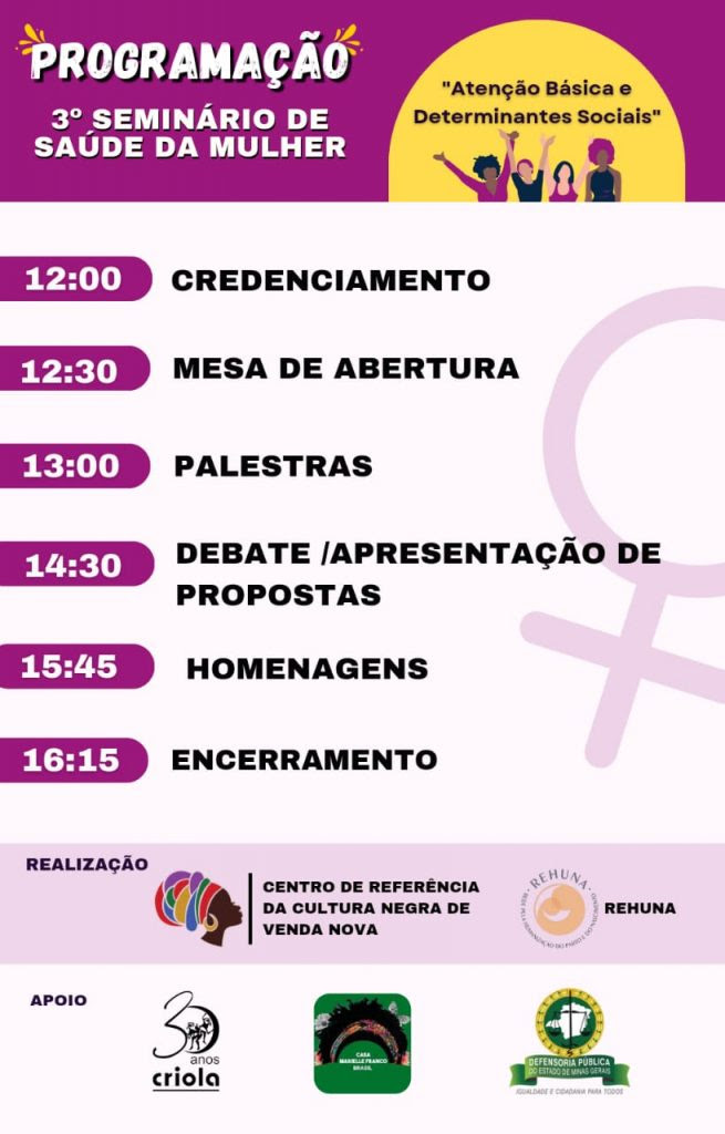 No dia 29 de julho acontece o 3º Seminário de Saúde da Mulher “Atenção Básica e Determinantes Sociais”, no Centro de Referência da Cultura Popular e Tradicional Lagoa do Nado, no bairro Itapoã, em Belo Horizonte/MG.
