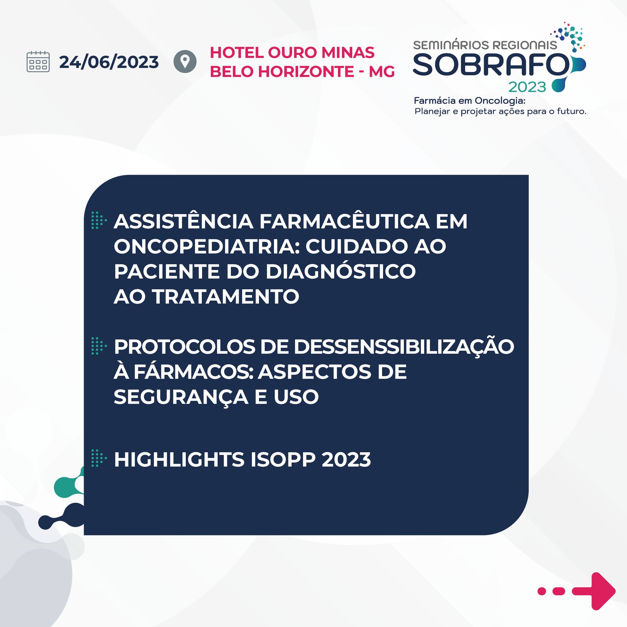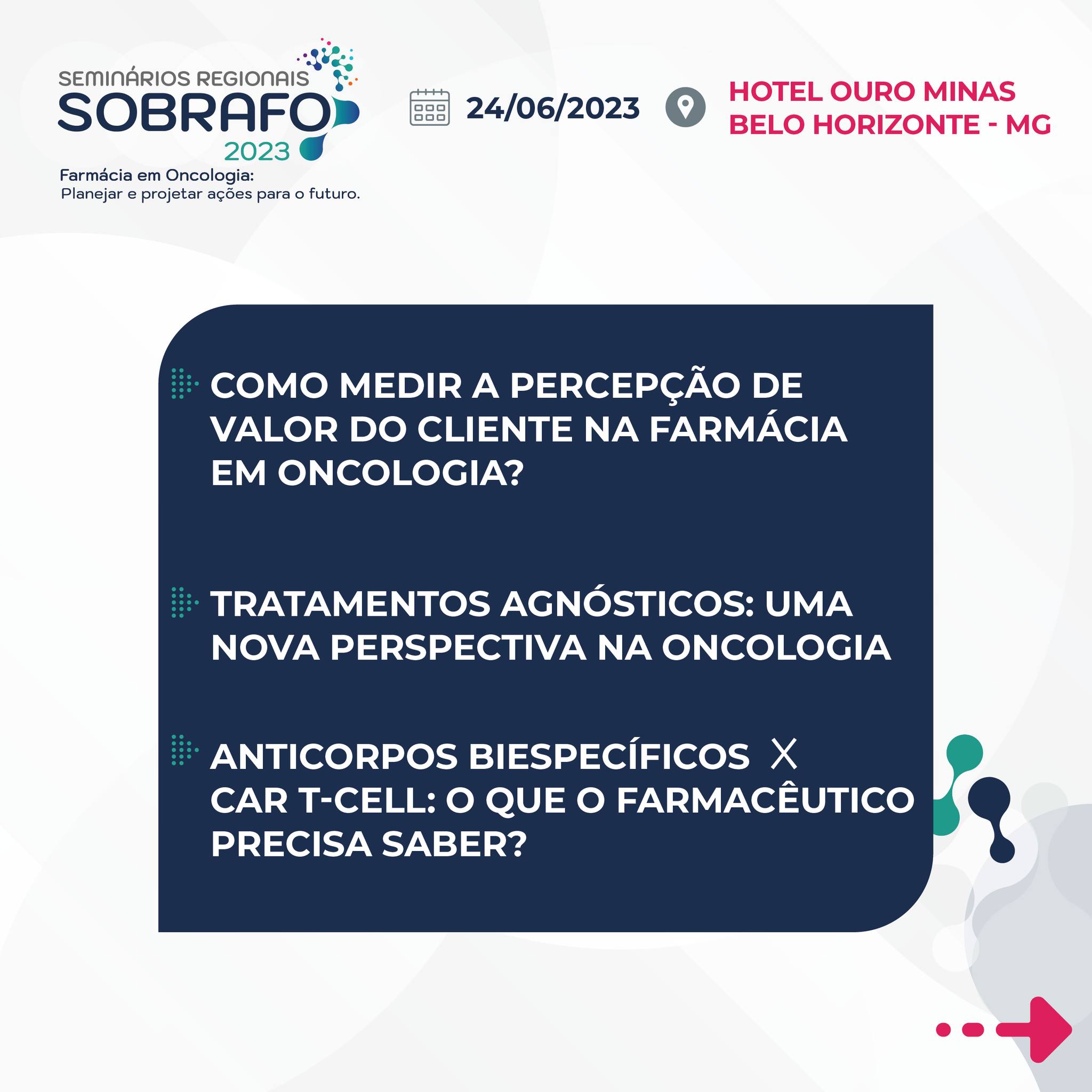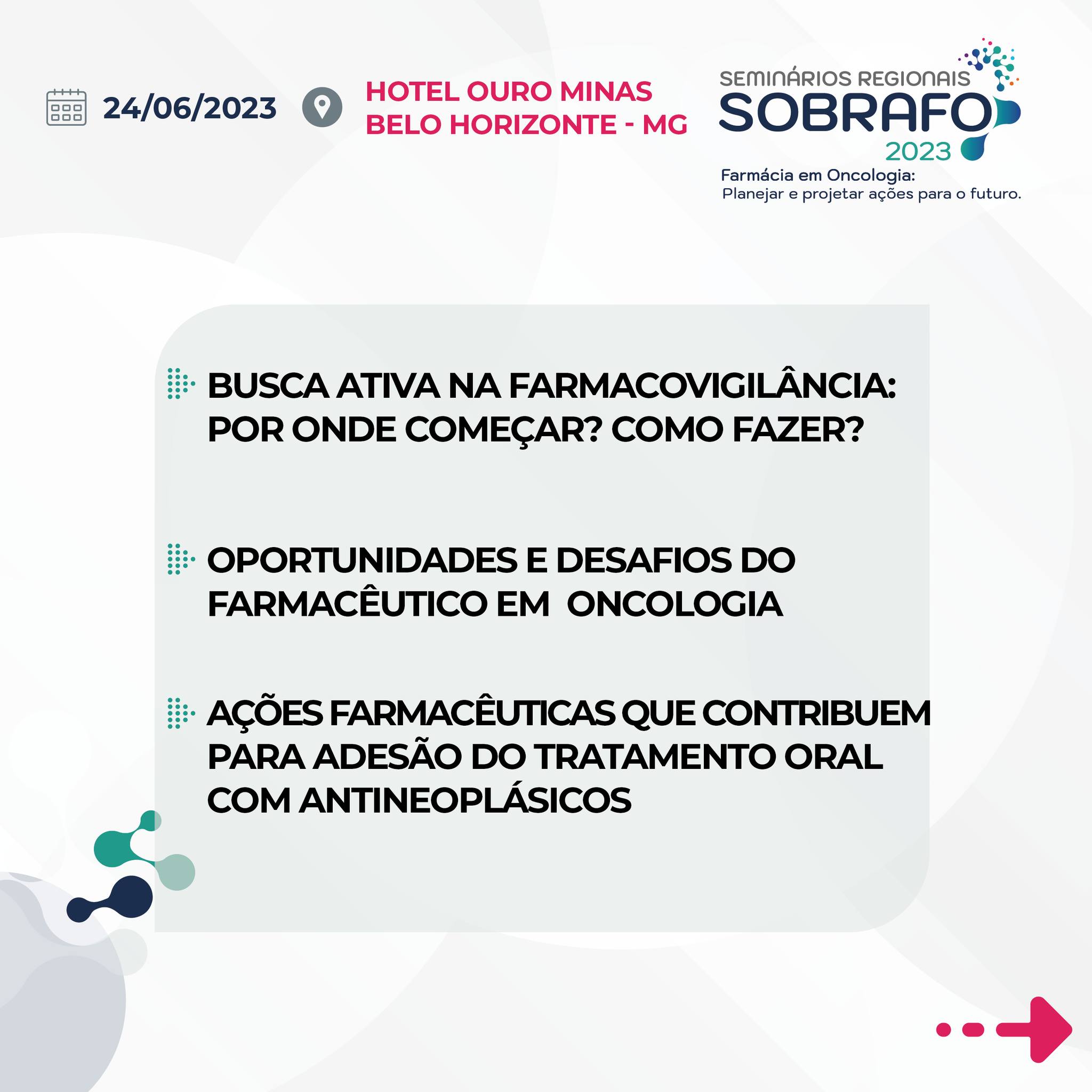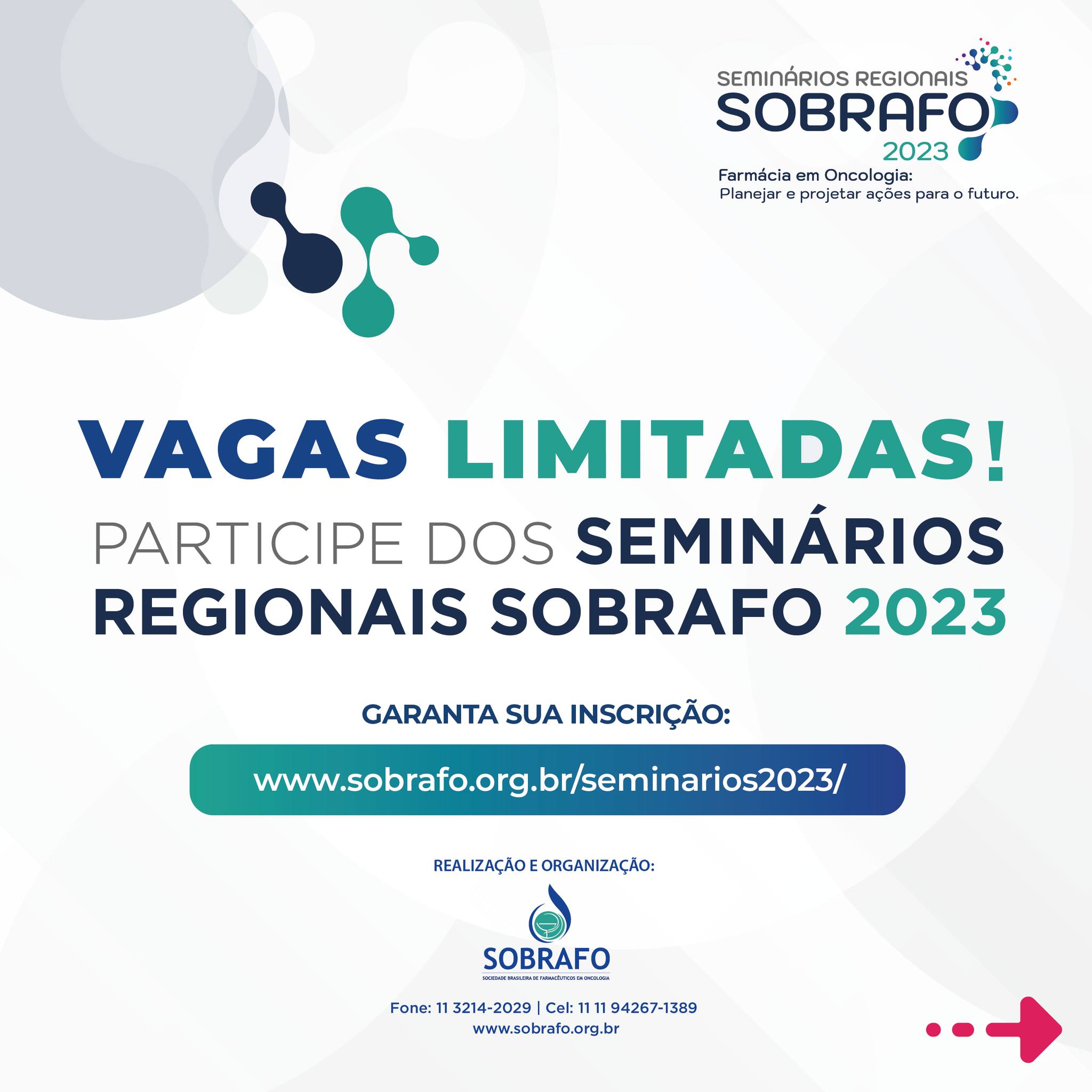 Neste contexto, temos a certeza de que os Seminários Regionais SOBRAFO 2023 serão importante instrumento para divulgação, atualização, reflexão e promoção das melhores práticas entre farmacêuticos que atuam na melhoria das condições de saúde do paciente em tratamento de câncer!