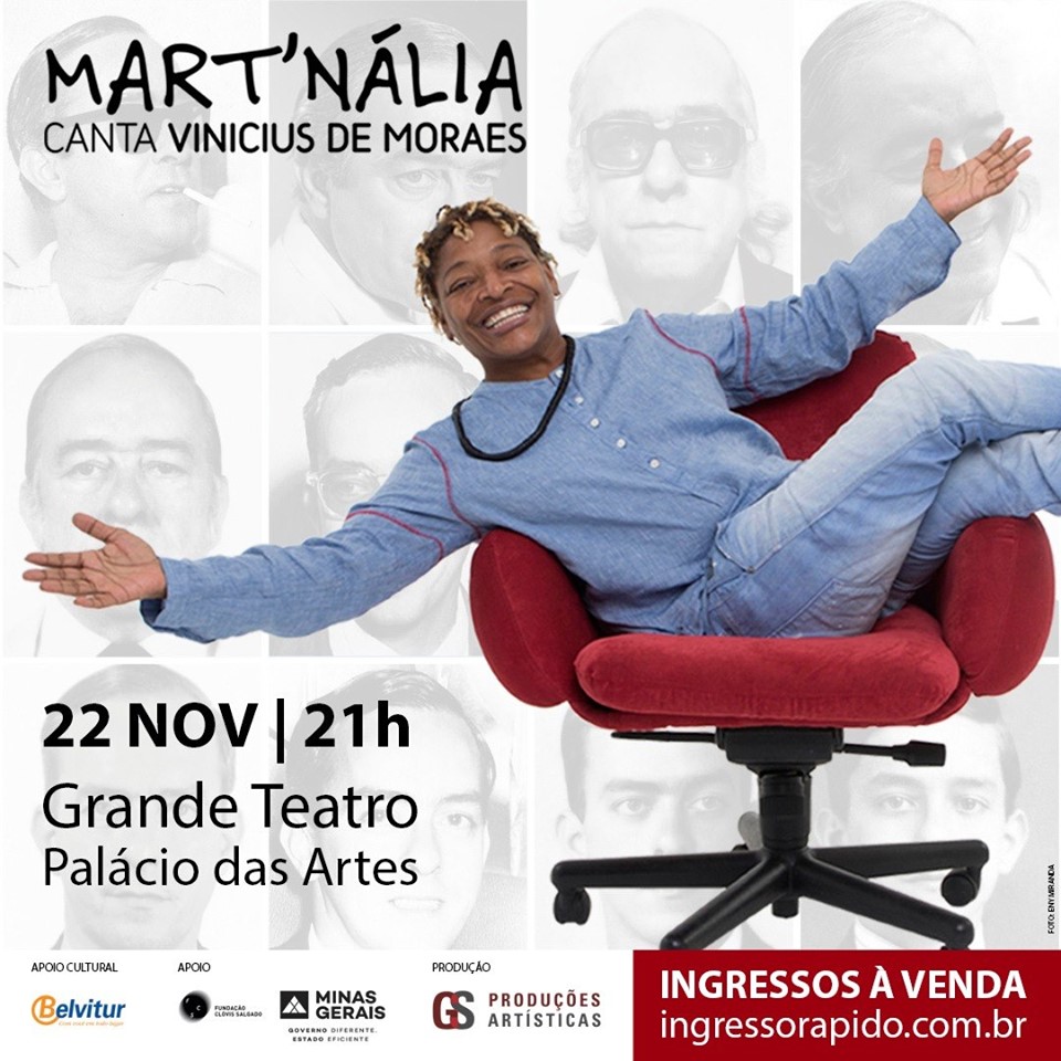 Nada poderia representar melhor o coração inflamado do que unir Vinicius e Mart’nália. O álbum e o show “Canta Vinícius” tem direção geral de Marcia Alvarez e Mart’nália. O cd foi uma produção musical de Arthur Maia e Celso Fonseca com 12 faixas. No repertório do show ‘A Tonga da Mironga’, ‘Minha Namorada’, ‘Deixa’, ‘Sabe Você’, ‘Um Pouco Mais de Consideração’, ‘Eu Sei Que Vou Te Amar’, ‘Onde Anda Você’, ‘Tarde em Itapoã’, ‘Você e Eu’, ‘Insensatez’, ‘Maria Vai Com as Outras’, ‘Canto de Ossanha’, além de outras canções já gravadas como ‘Pra que chorar’, ‘Mulata do Sapateado’, ‘Tempo feliz’, ‘Sei Lá’, e outras mais.... O público irá cantar e se emocionar!
