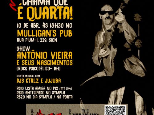 O Chama que é Quarta chega à terceira edição no The Mulligan’s Pub como alternativa para um dos melhores happy hours de BH: música criativa, bons drinks e comidas deliciosas. Antônio Vieira e Seus Nascimentos é a atração da vez. A banda promete um show explosivo e irreverente, com a energia setentista brasileira e referências que vão da tropicália ao sempre exaltado Raul Seixas.
