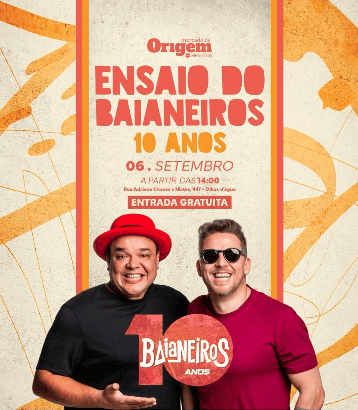 O Mercado de Origem recebe uma festa inesquecível no dia 06 de setembro, para celebrar os 10 anos do Baianeiros! Prepare-se para muita animação, música boa e aquela energia contagiante que só o Baianeiros sabe trazer.